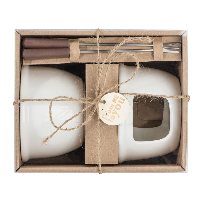 Porcelain chocolate fondue set, complete with two fondue forks. Perfect for dipping fruits or biscuits, this elegant gift set offers a delightful experience.