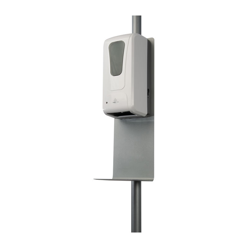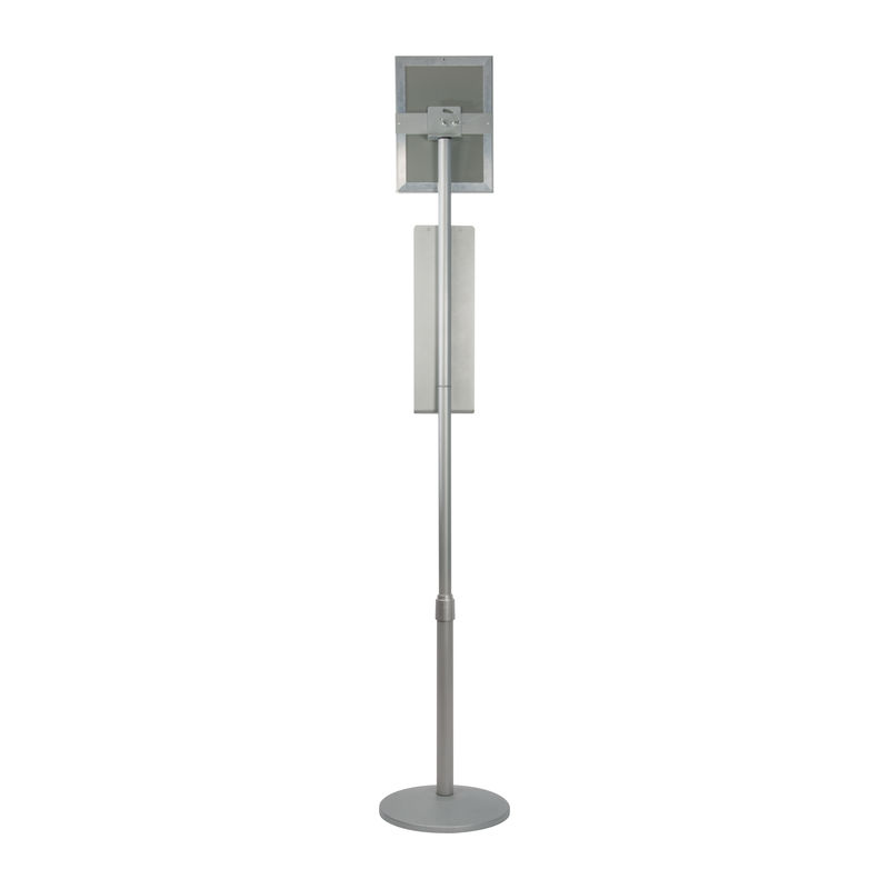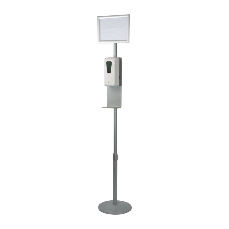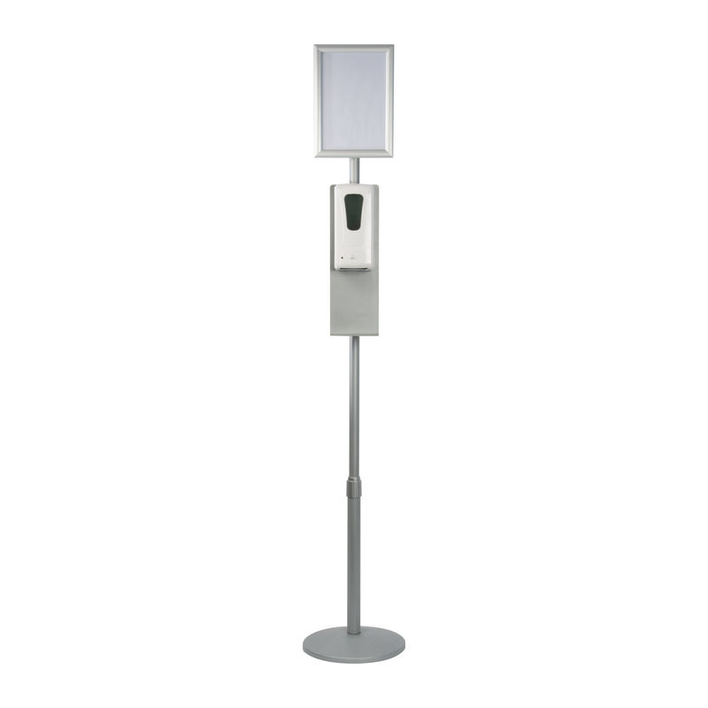 Disinfection column featuring a stable base, telescopic rod (125-165 cm), A4-sized advertising space, and a 1,000 ml container for disinfectant gel or liquid. Batteries are not included. Ideal for authorities, restaurants, shops, or companies. Customise your advertising message on A4 paper at any time.