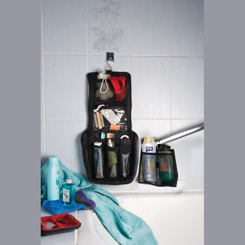 Our recommended Toilet Bag La Rochelle is crafted from durable nylon and features a spacious interior. It includes a transparent zippered compartment, a stretch band with five loops, three large mesh compartments, and two mesh compartments with a detachable metal hook secured by Velcro for hanging toiletries such as shampoo or shower gel. The bag offers a 270-degree surround zipper and an additional metal hook for convenient hanging.