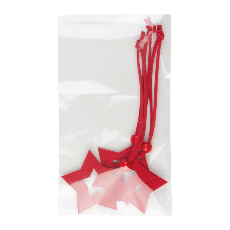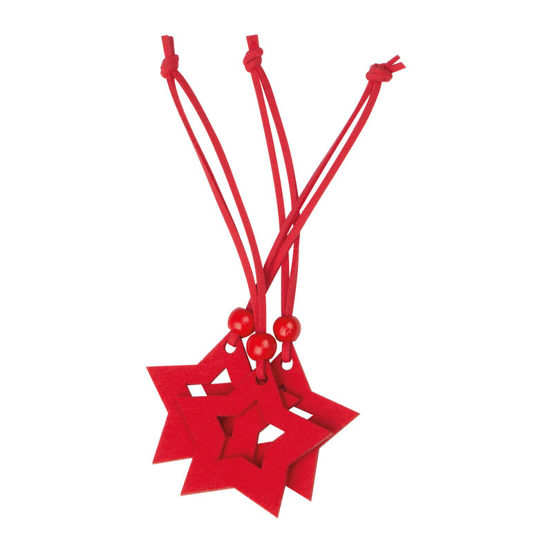 Set of three red felt stars with cord and wooden bead, suitable for decoration beyond the Christmas season. Your logo will be applied to the individual packaging via label.