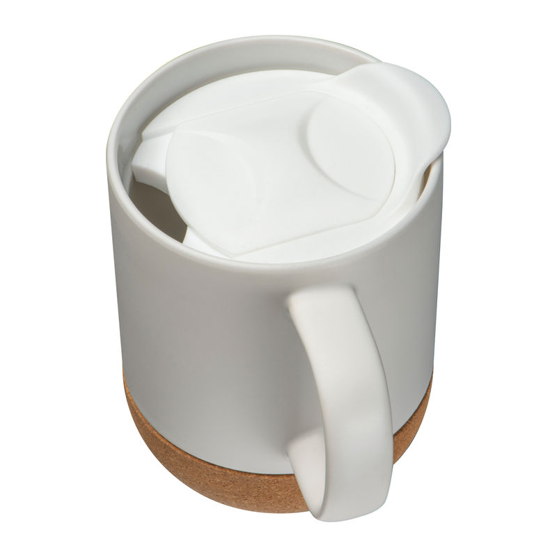 Sublimation mug featuring a lid and a removable cork base, with a capacity of 300 ml. Each unit is individually packaged in a cardboard box.