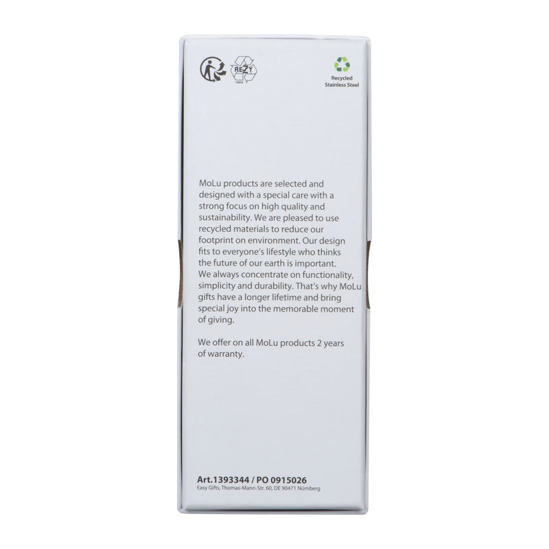 - Material: recycled stainless steel, stainless steel, rubber
