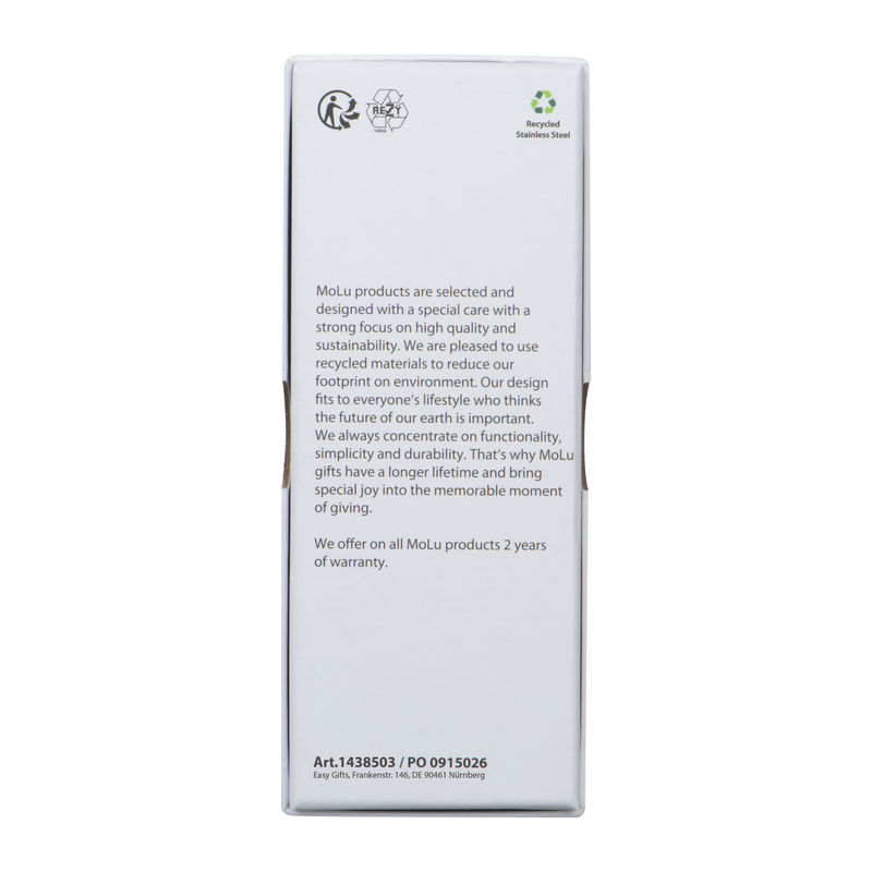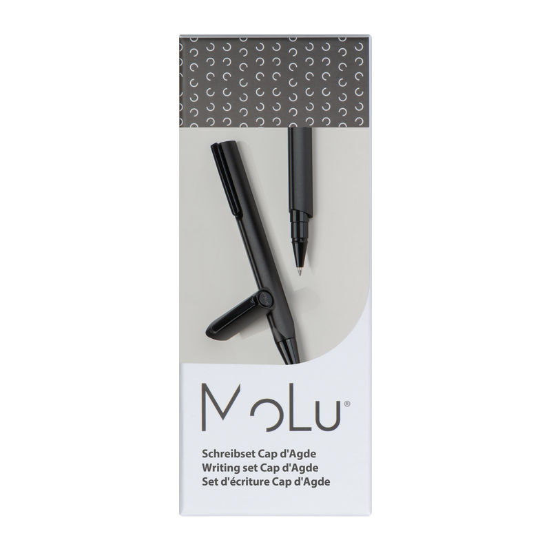 This writing set includes an elegant twist-action ballpoint pen and a stylish rollerball pen (both with blue ink), distinguished by their unique triangular shape. This design is not only visually appealing but also ergonomically crafted to provide maximum comfort when held. Based on the principles of the golden ratio, the distinctive design perfectly balances beauty and functionality.•MoLu pens are made from high-quality recycled metal, offering not only an elegant appearance but also durability and sturdiness. Each pen is fitted with a Parker-style high-capacity refill, ensuring smooth and comfortable writing. The MoLu pen is available in both ballpoint and rollerball versions, allowing you to choose the writing instrument that best suits your needs. Thanks to the refillable mechanism, cartridges can be easily replaced, making the pen reusable time and again.•Whether for the office, school, or personal notes, the MoLu writing set is the ideal companion for those who value both quality and design. Supplied in exclusive packaging with a 2-year warranty.