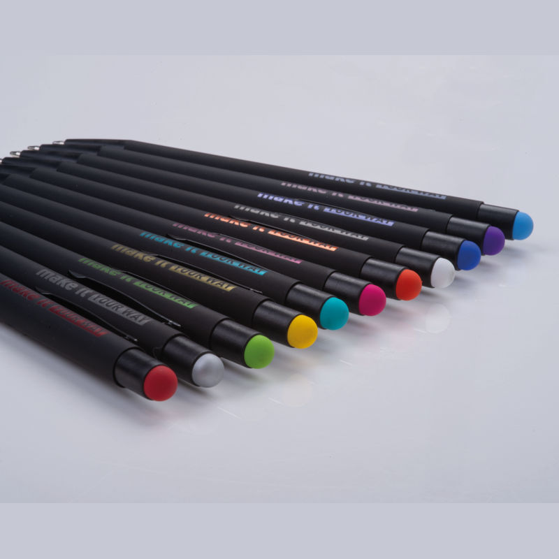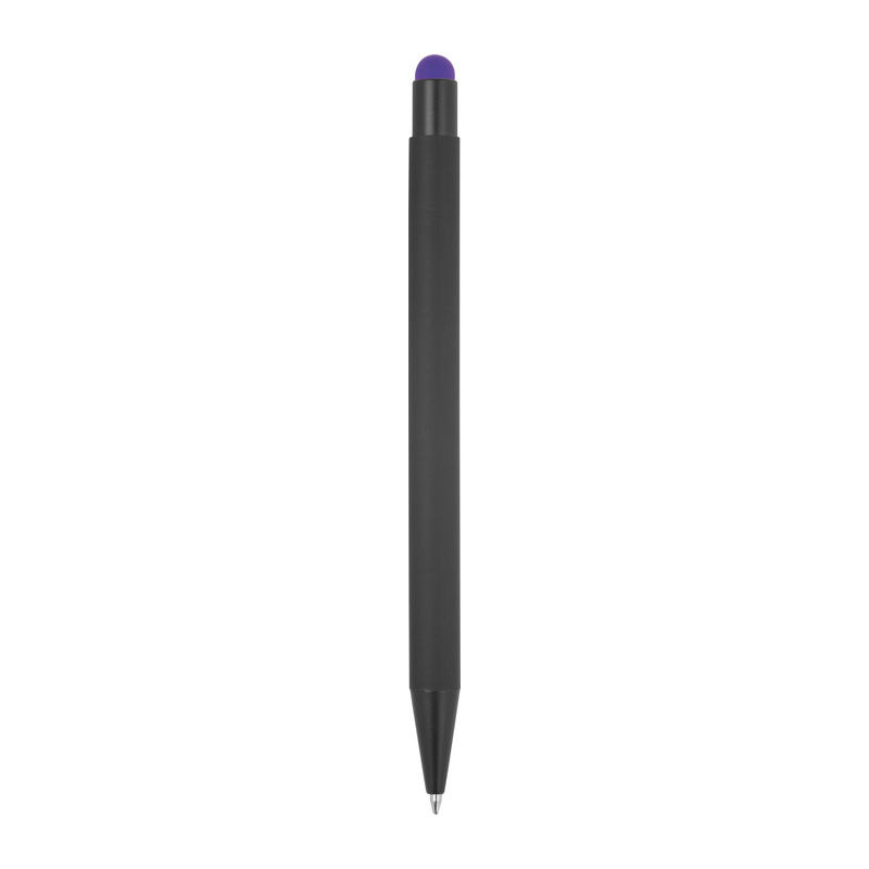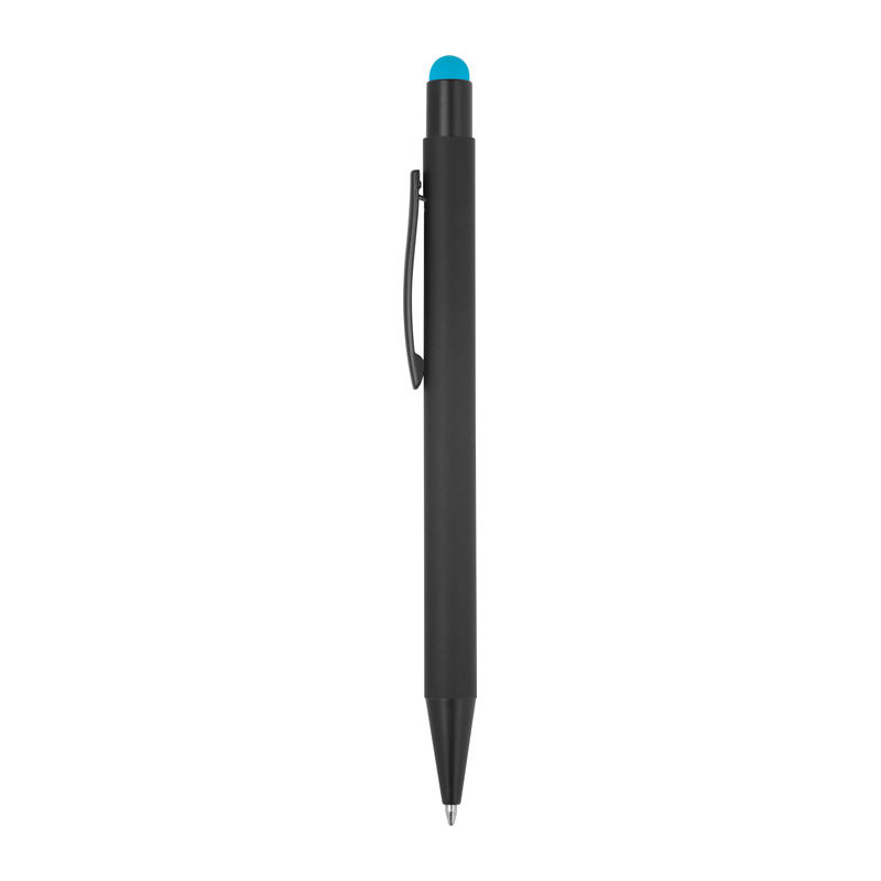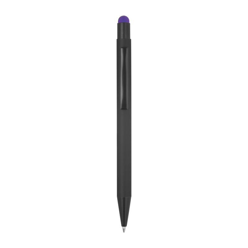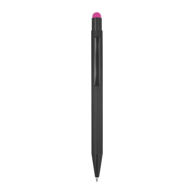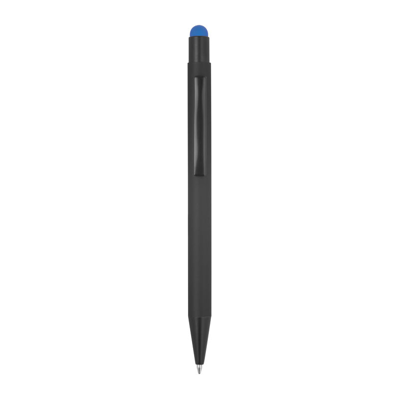 Black metal ballpoint pen featuring a tactile rubber finish, a blue ink refill, and a touch-sensitive tip. The black barrel is complemented by a coloured rubberised touch grip available in a variety of shades—ideal for engraving, which appears in colours matching the touch pen, making it perfect for everyday use.