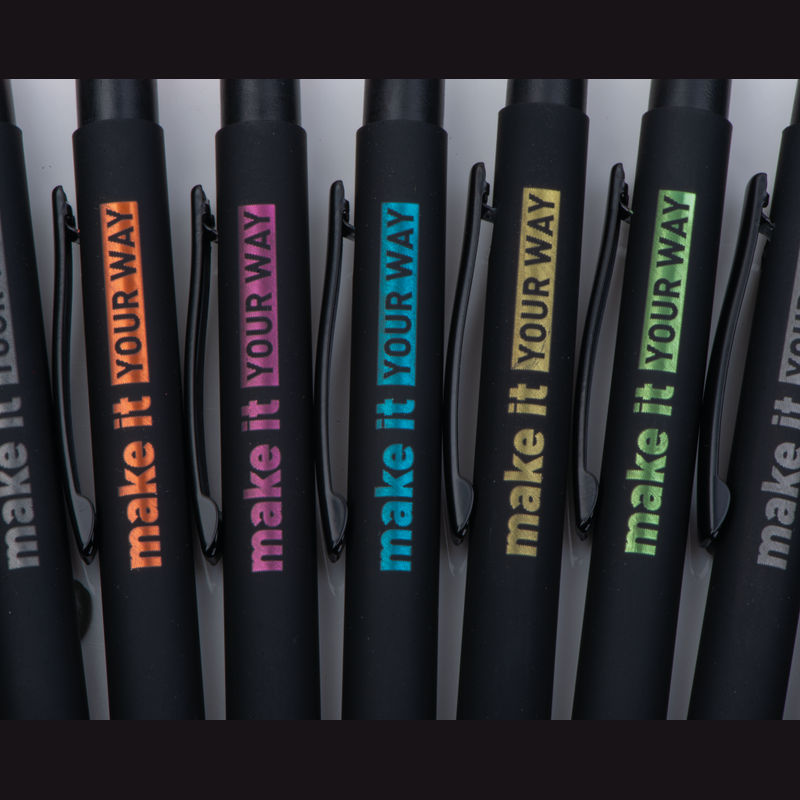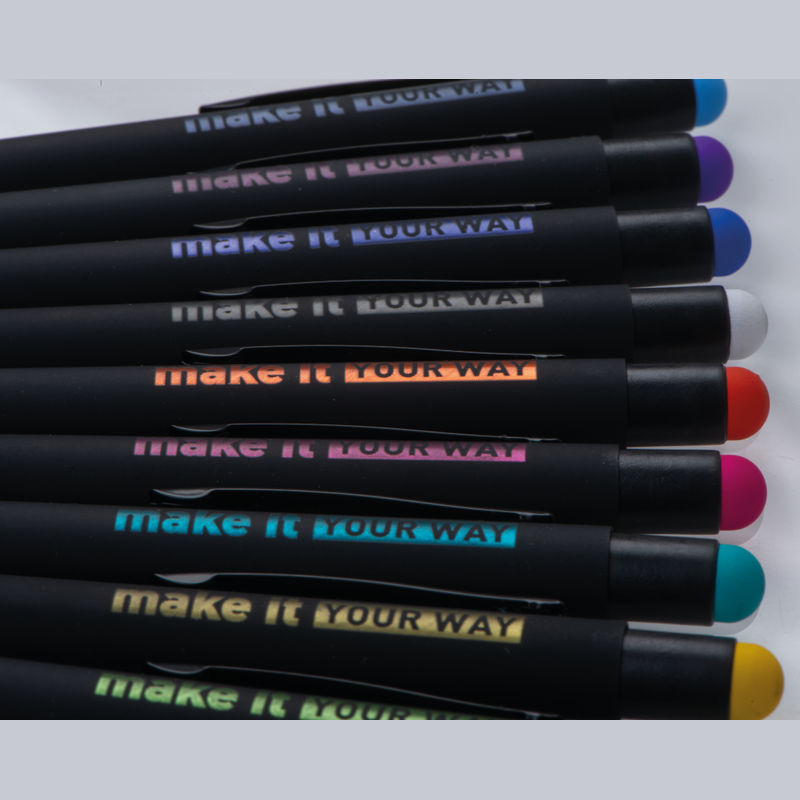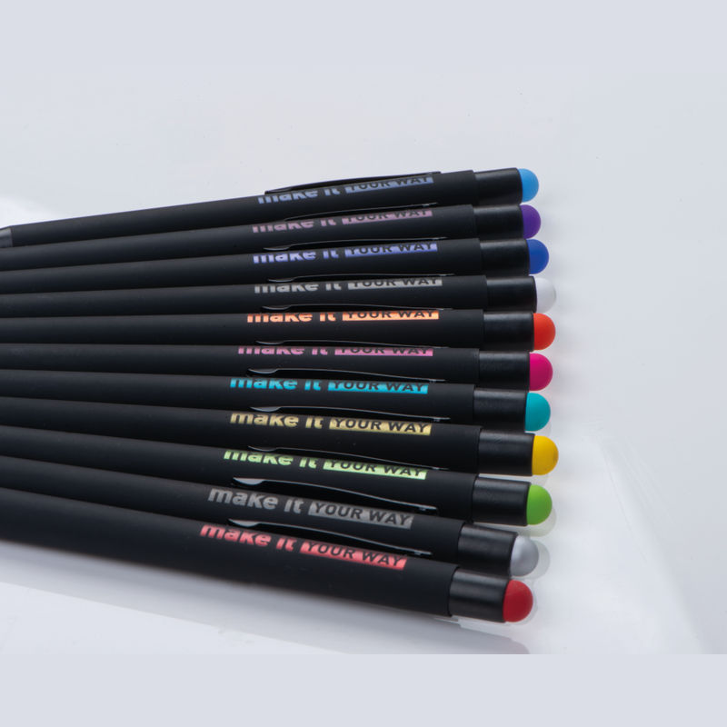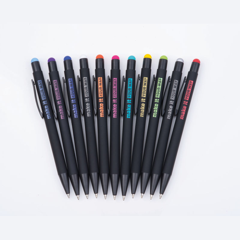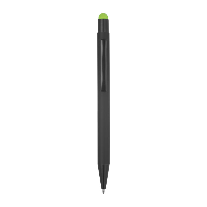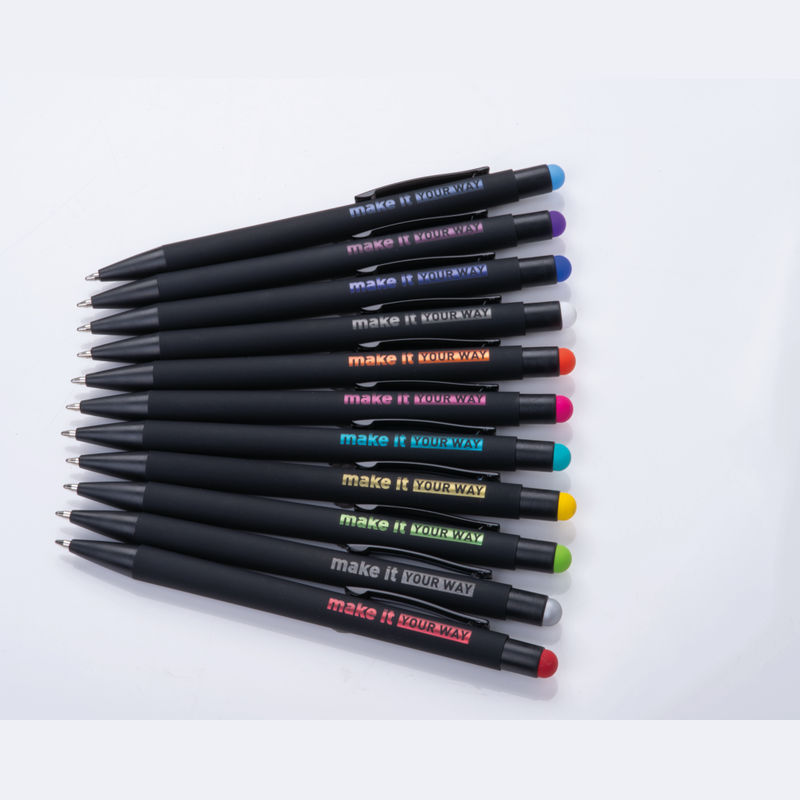 Black metal ballpoint pen featuring a tactile rubber finish, a blue ink refill, and a touch-sensitive tip. The black barrel is complemented by a coloured rubberised touch grip available in a variety of shades—ideal for engraving, which appears in colours matching the touch pen, making it perfect for everyday use.