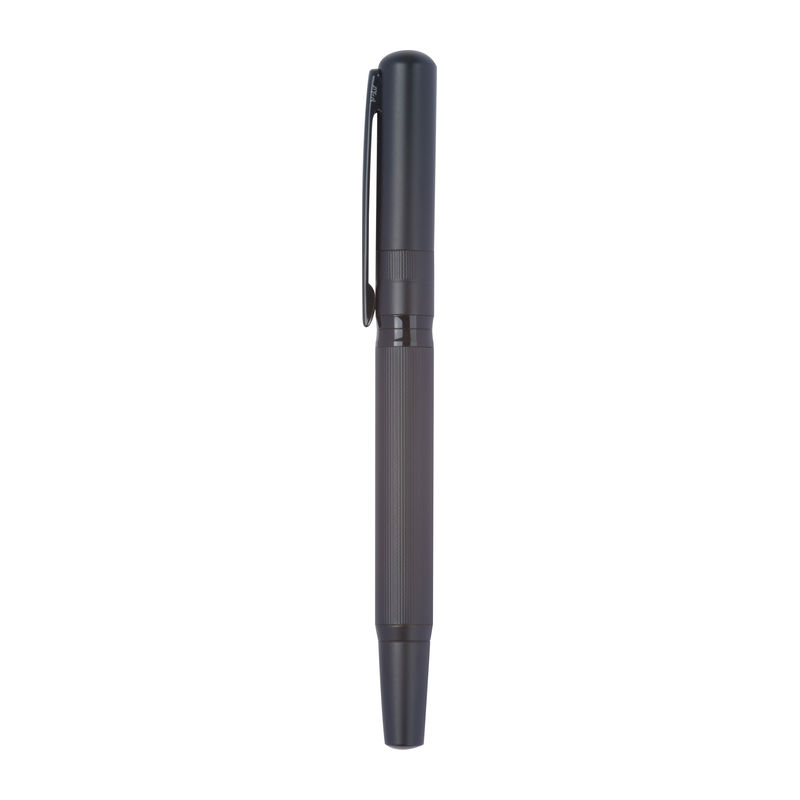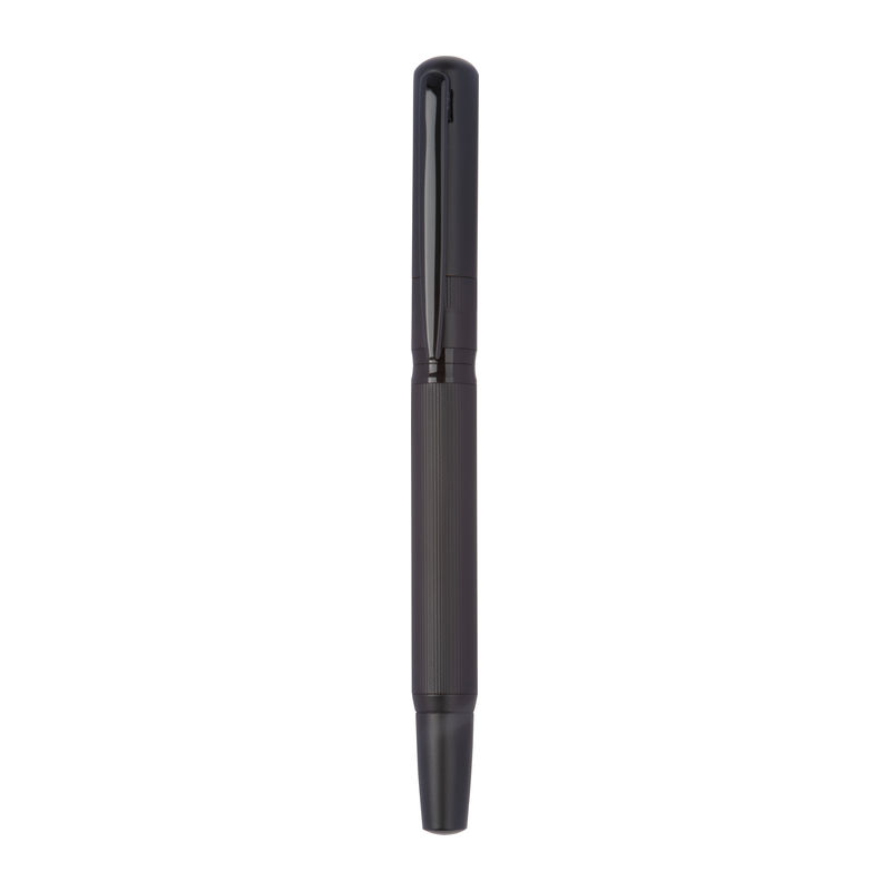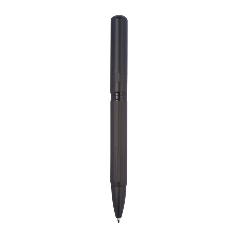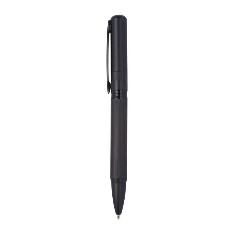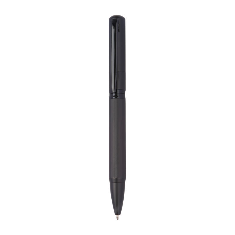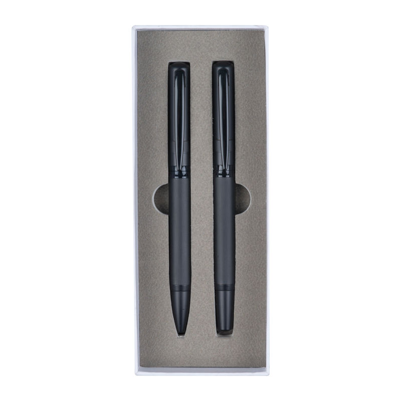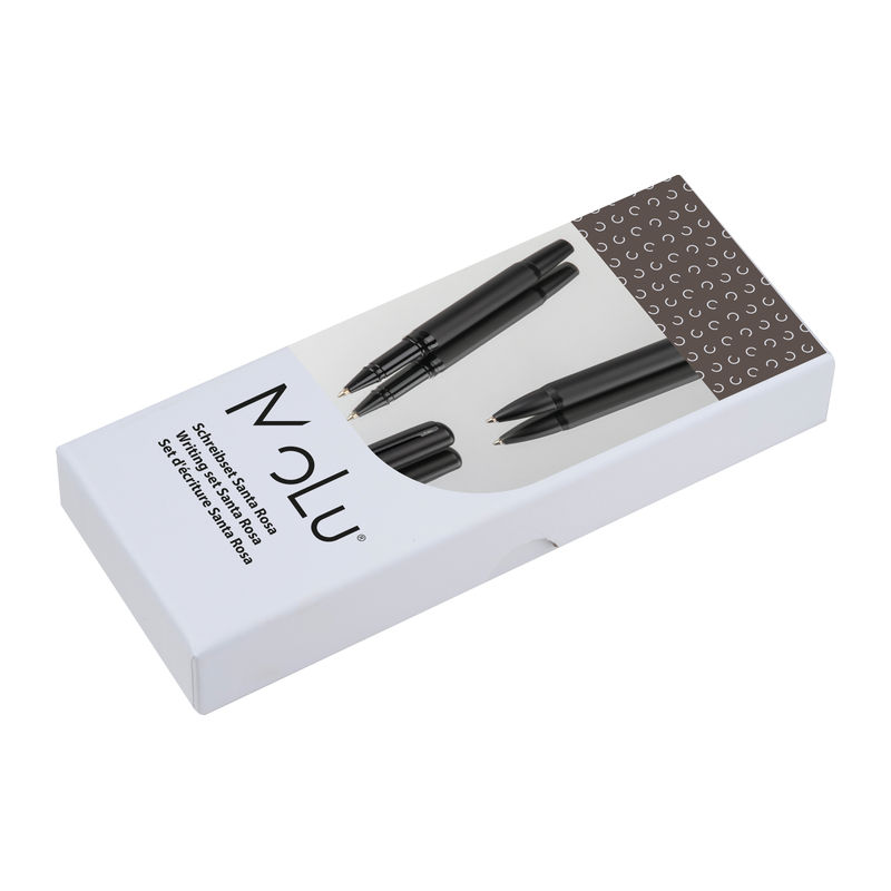 A premium blue-ink writing MoLu set comprising a rollerball pen and a twist ballpoint pen made of recycled stainless steel, both equipped with blue ink refills and presented in an elegant design. Enhanced with the MoLu logo, discreetly printed in matte black on the black ring. Ideal for sophisticated writing and an exclusive gift. Presented in exclusive gift packaging with a 2-year warranty.