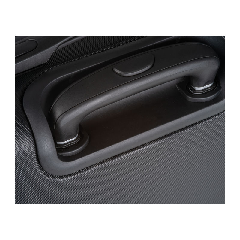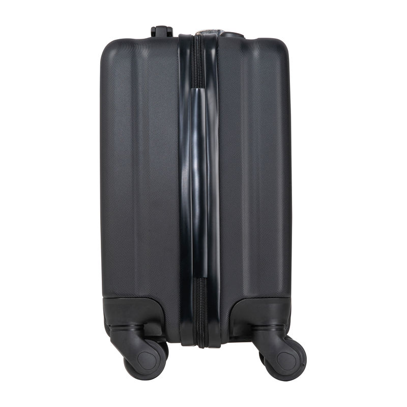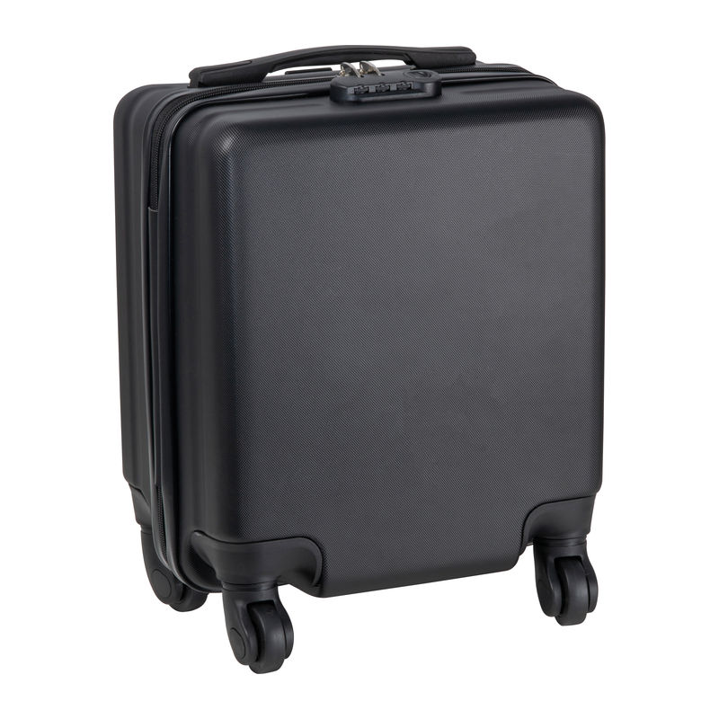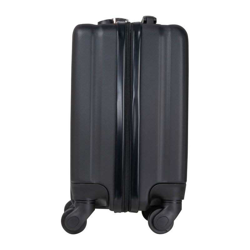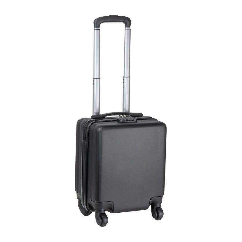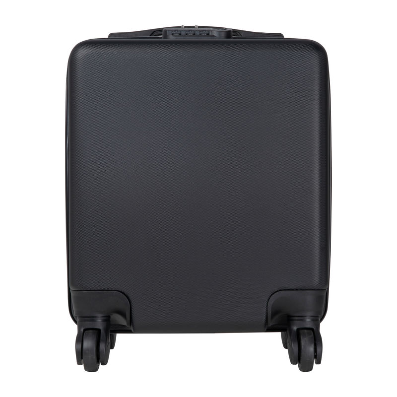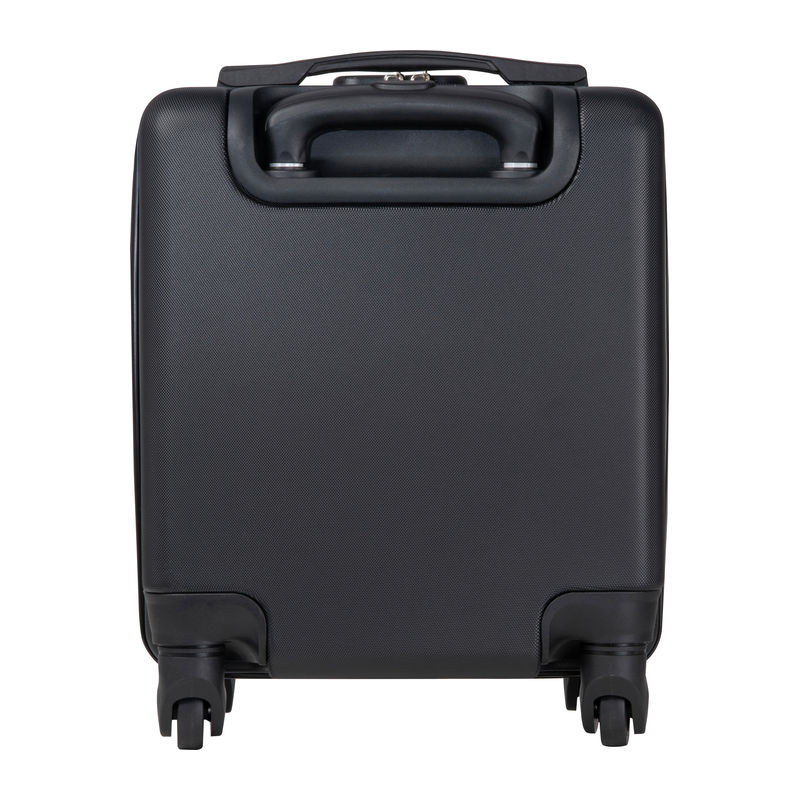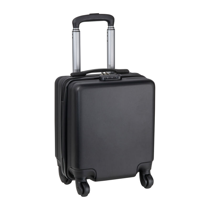 A black trolley designed to fit conveniently under the aircraft seat. It offers space for laptops up to 14 inches and additional compartments for personal belongings. Ideal for business travel or weekend breaks – combining functionality, style, and comfort.