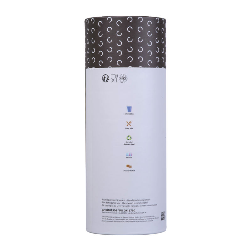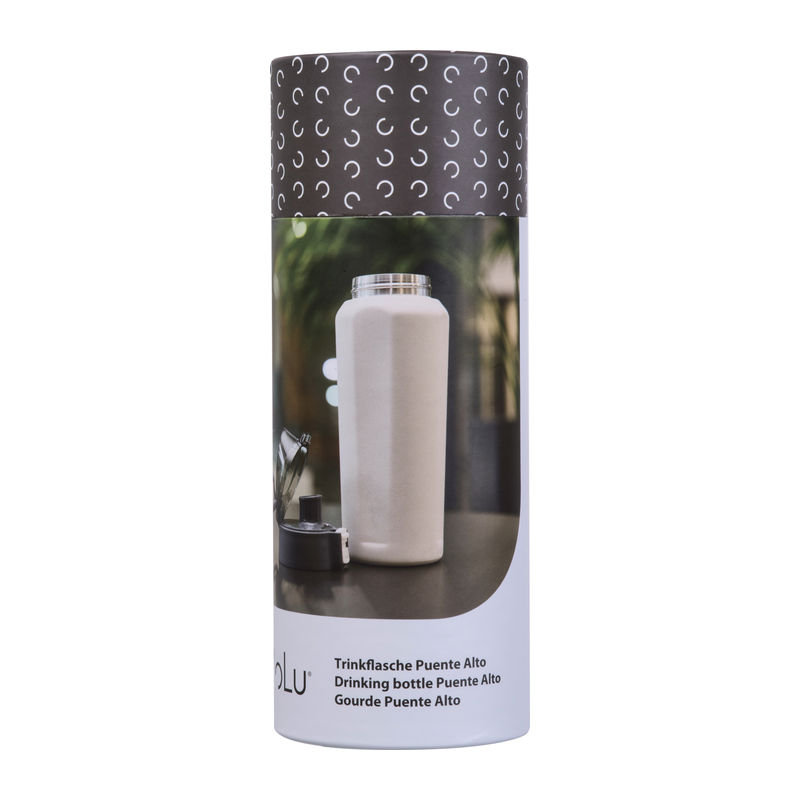 A stylish MoLu bottle crafted from recycled stainless steel, featuring double-wall vacuum insulation to keep beverages hot or cold for extended periods. The bottle has a capacity of 600 ml and is equipped with a practical click lid for ease of use. Functional, high-quality, and perfect for use on the go. Presented in exlusive gift packaging with 2-year warranty.