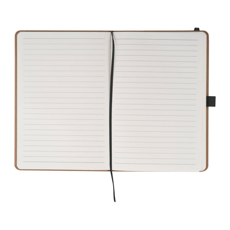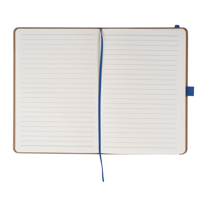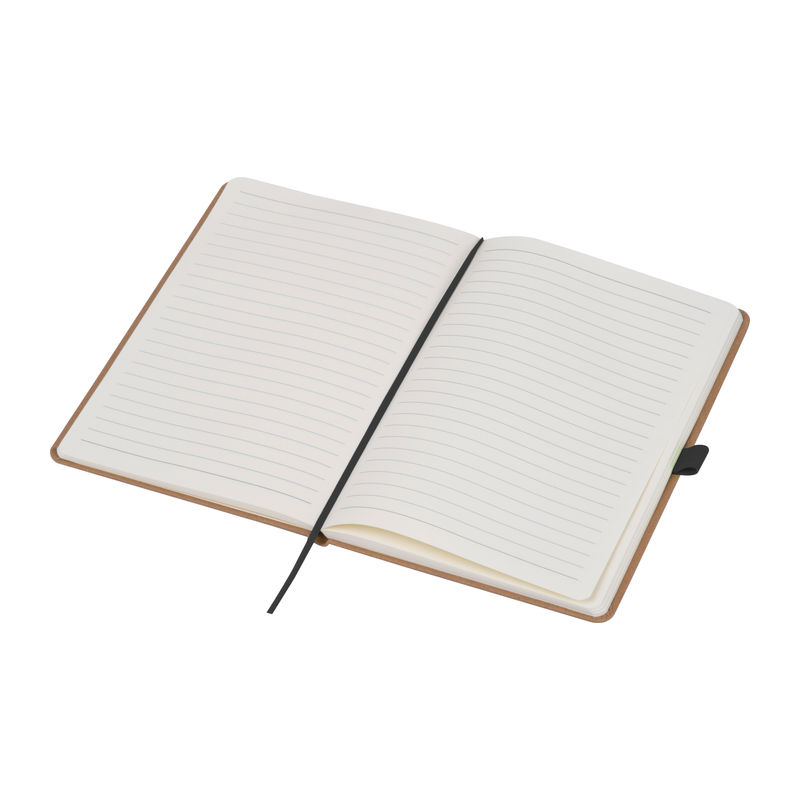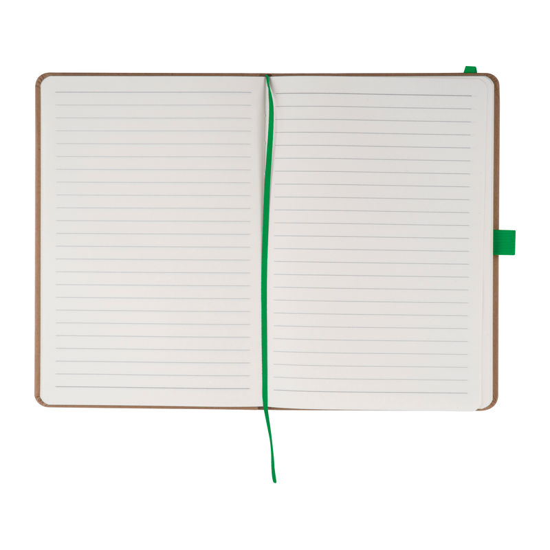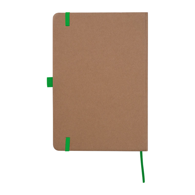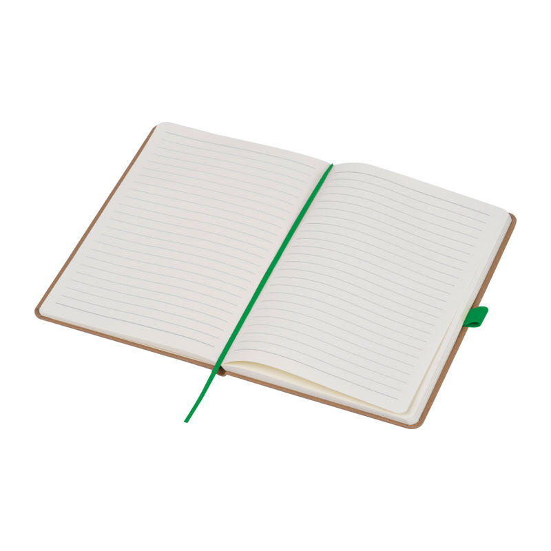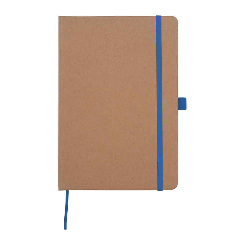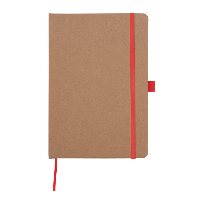 A5 notebook made from recycled paper featuring 160 lined pages, a bookmark, and a pen loop colour-coordinated with the closure band. Your branding can be printed on the outer cover.