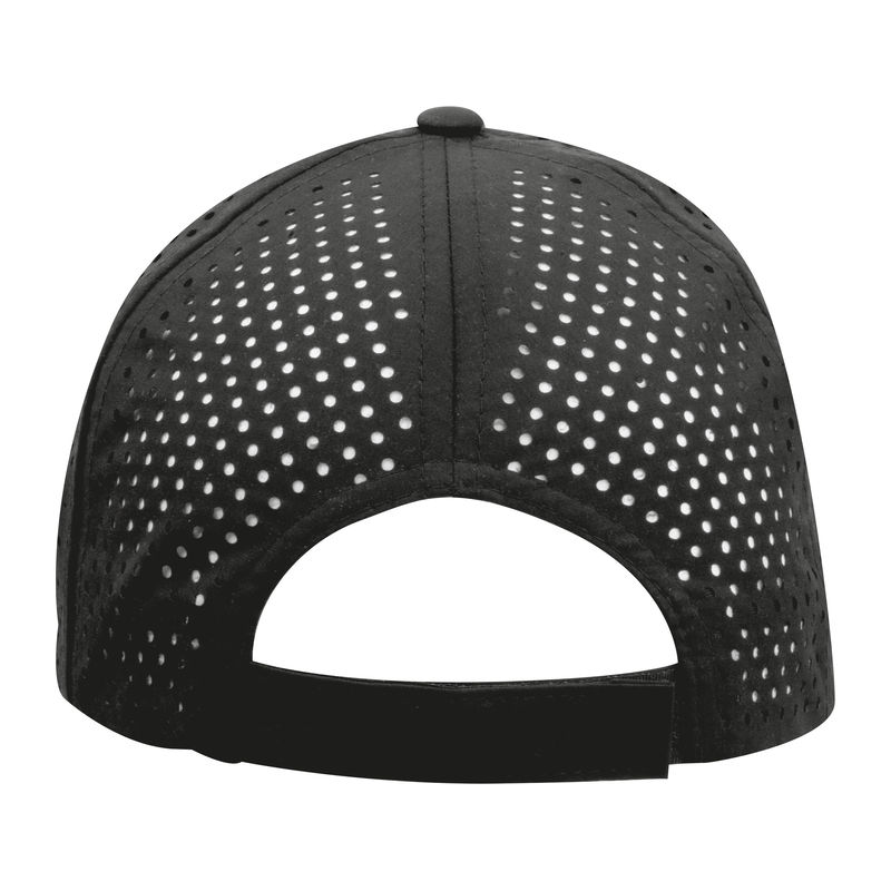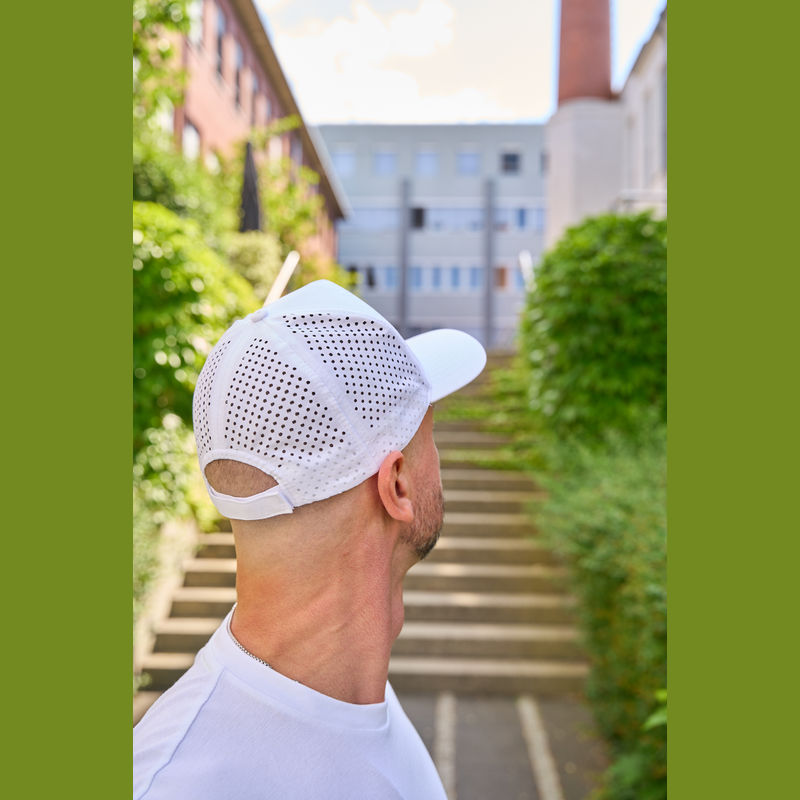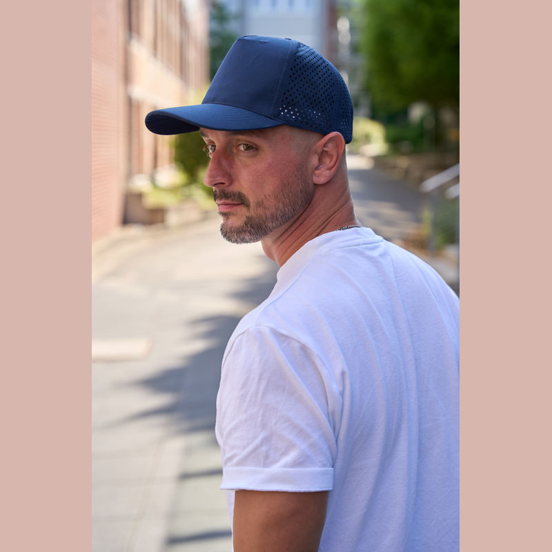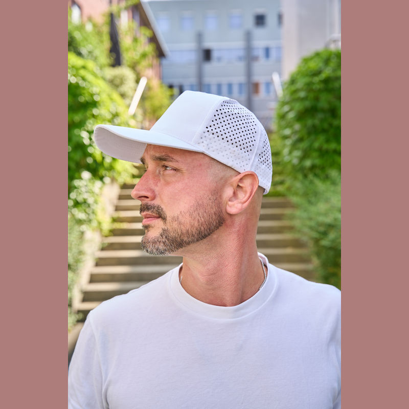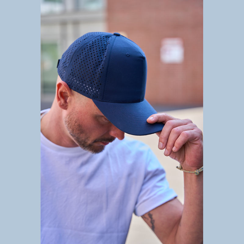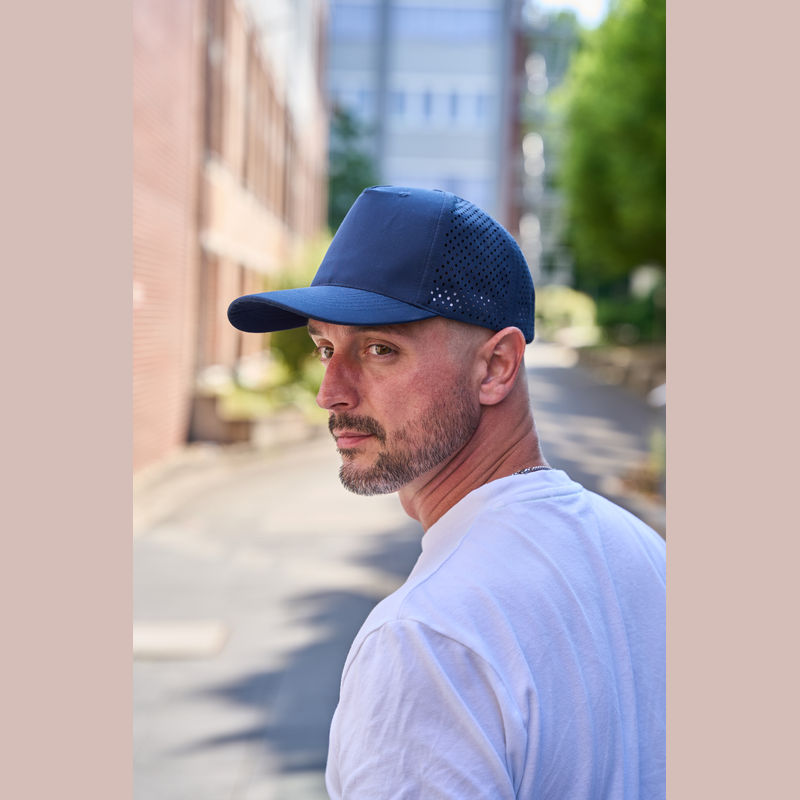 5-panel baseball cap made of polyester, featuring a hook-and-loop fastener at the rear and an internal sweatband. The perforated design ensures a particularly comfortable and breathable fit.