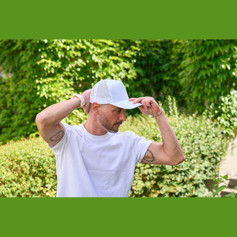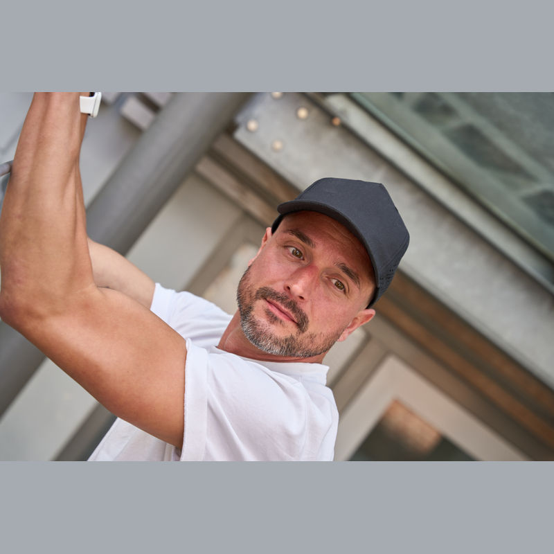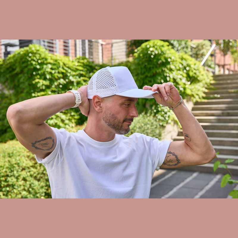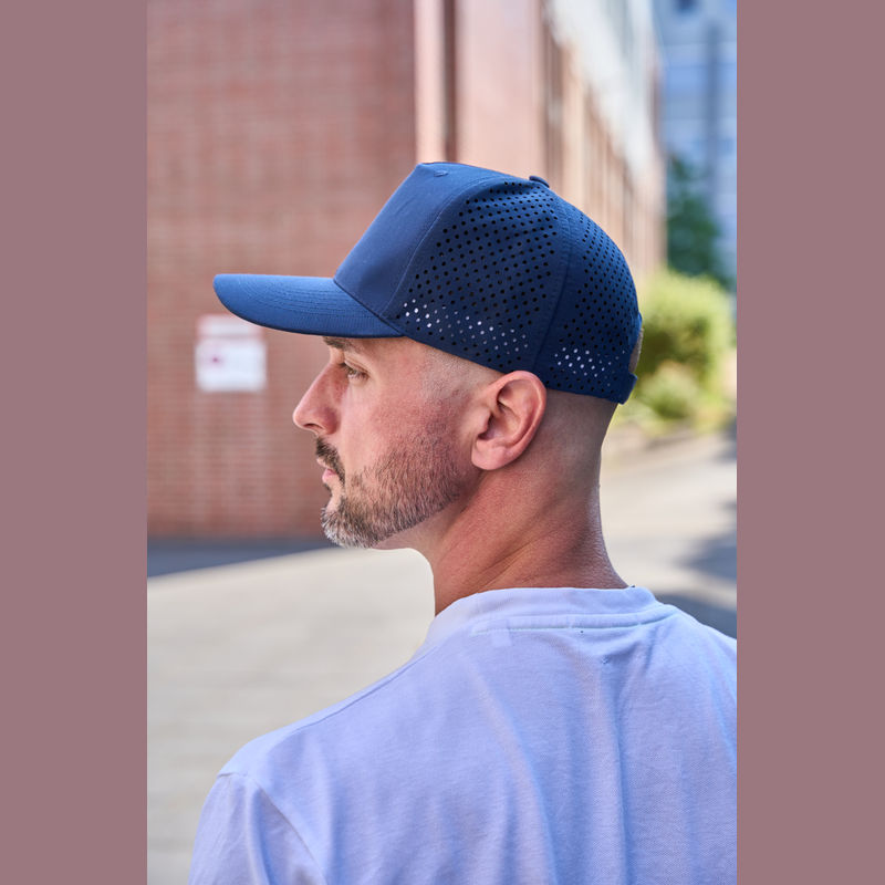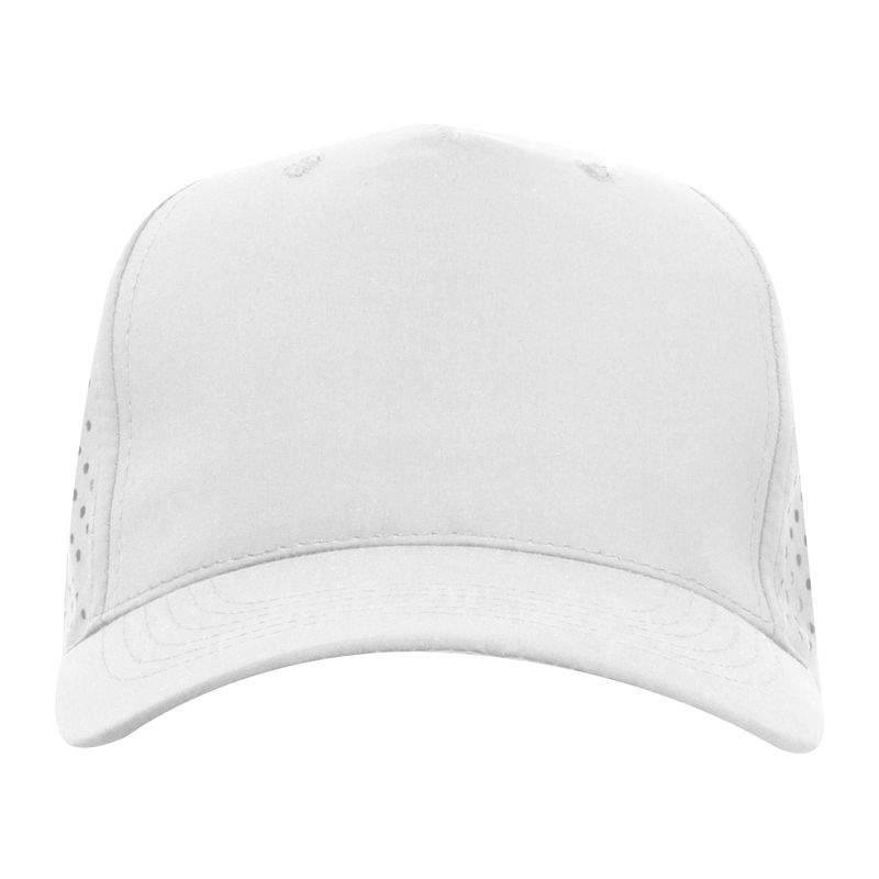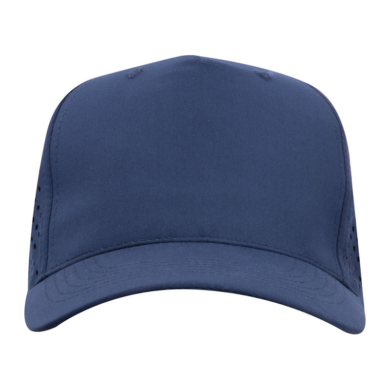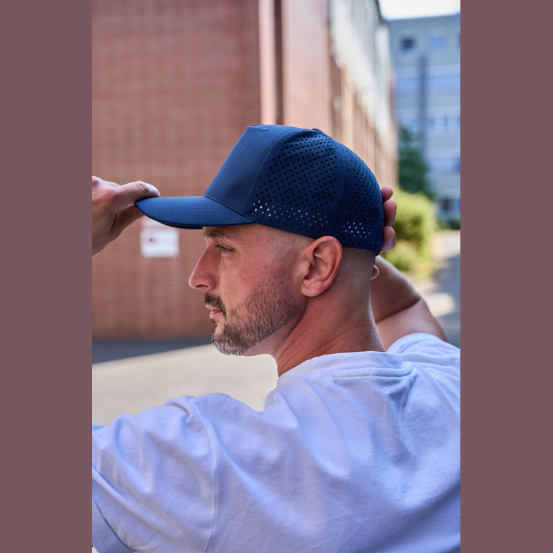 5-panel baseball cap made of polyester, featuring a hook-and-loop fastener at the rear and an internal sweatband. The perforated design ensures a particularly comfortable and breathable fit.