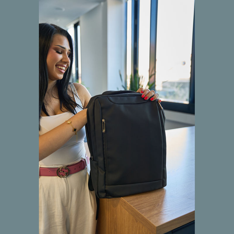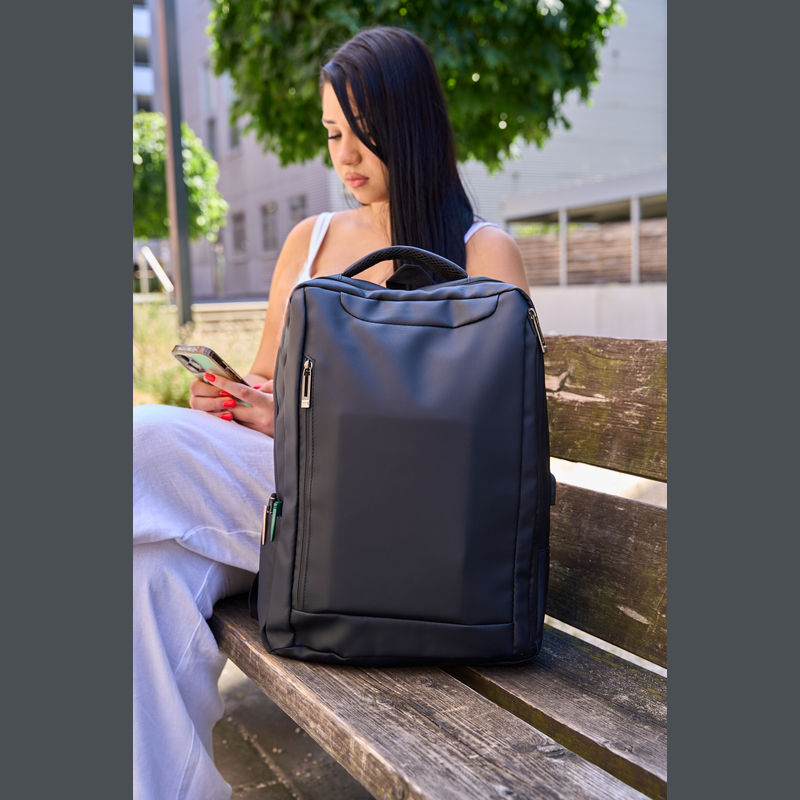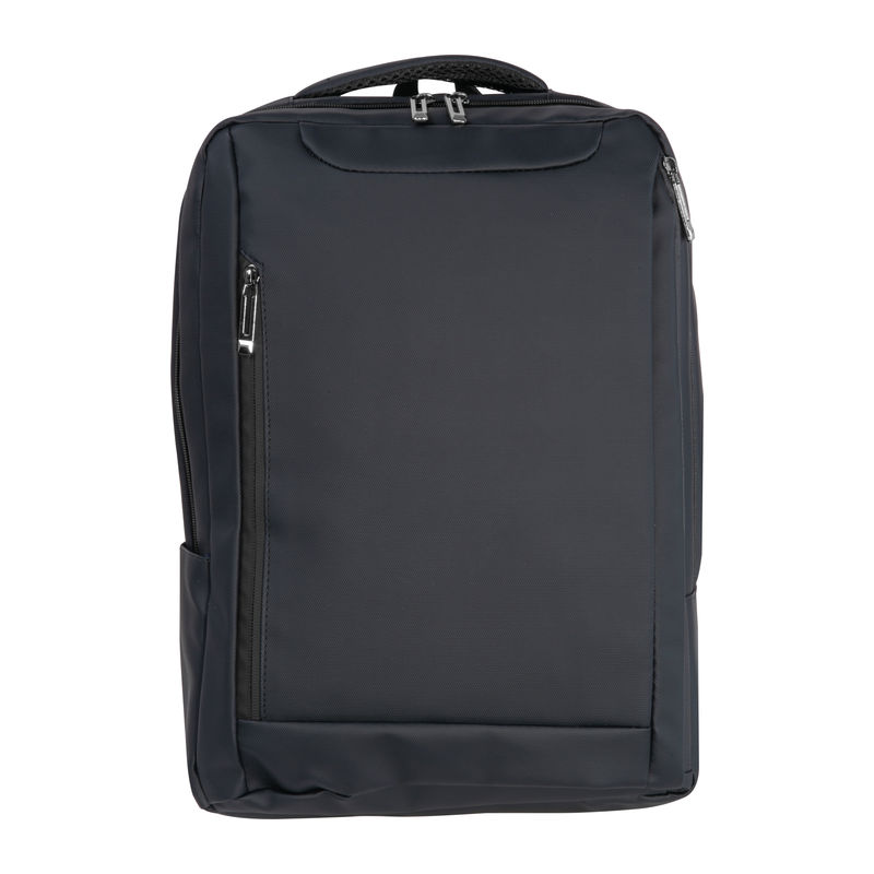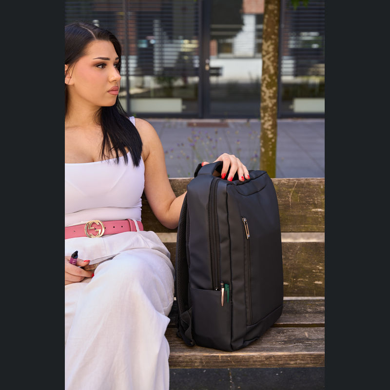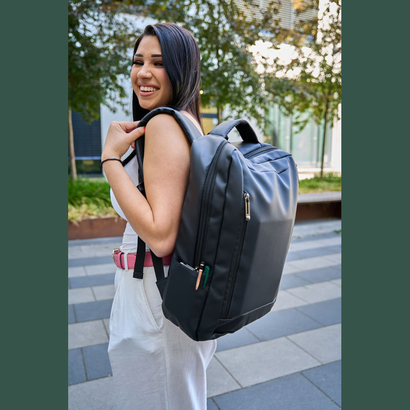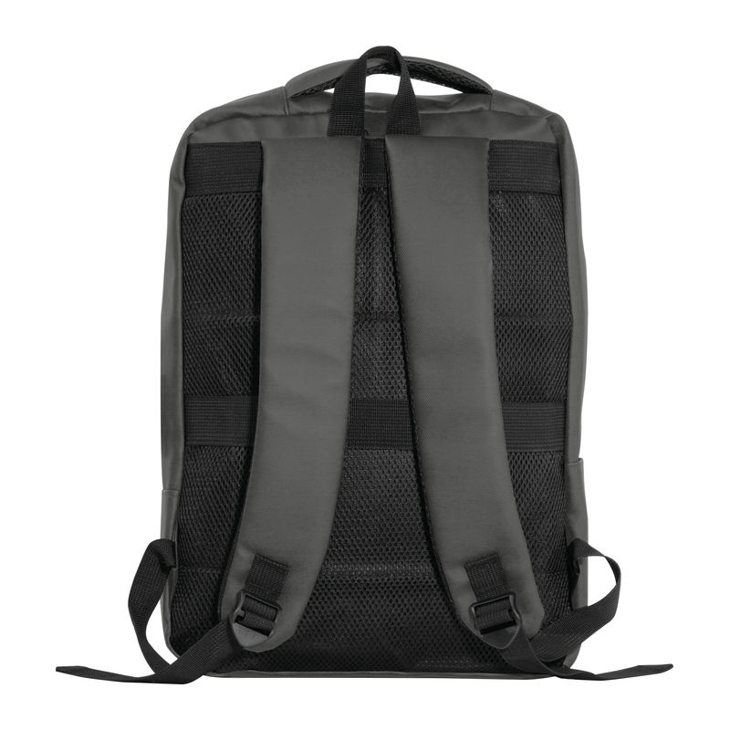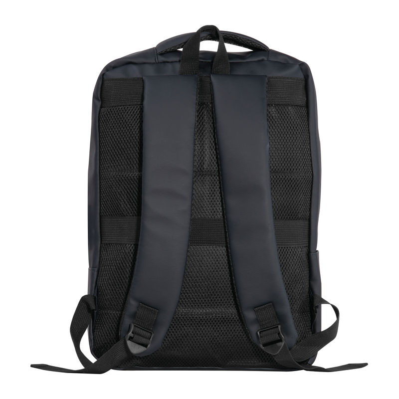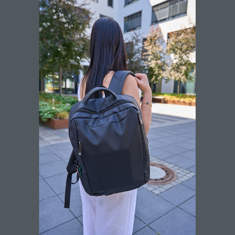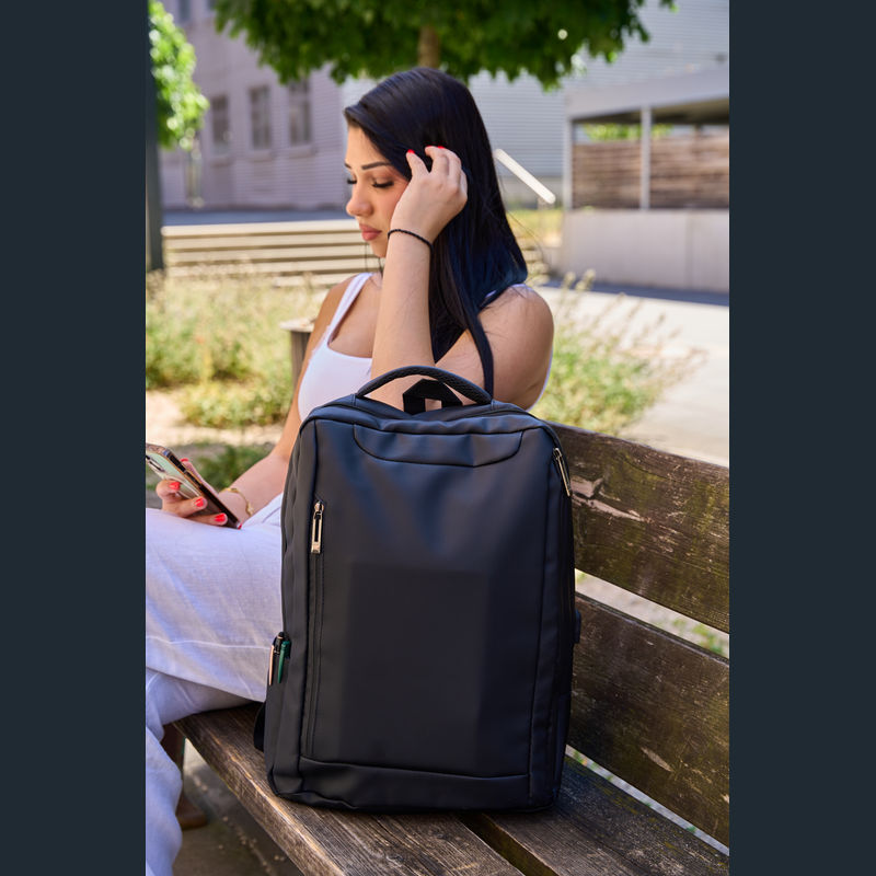 PU laptop backpack designed for 15-16 inch laptops. Features two zippered front compartments, a large main padded laptop compartment, multiple internal slip pockets, padded shoulder straps, a carry handle, and a rear strap for trolley attachment.