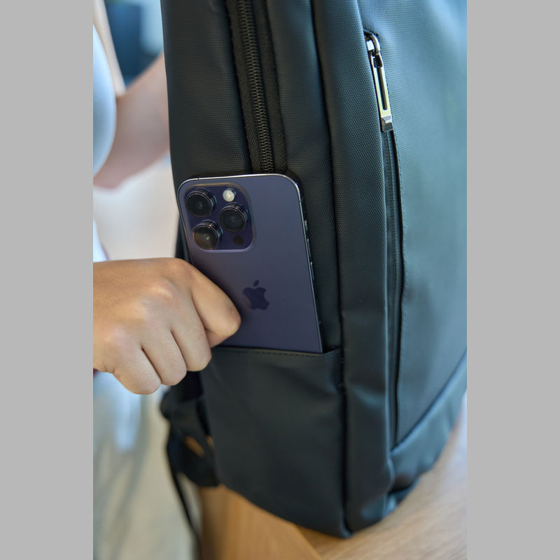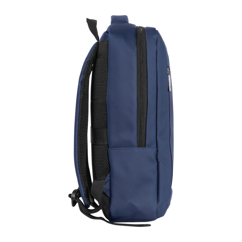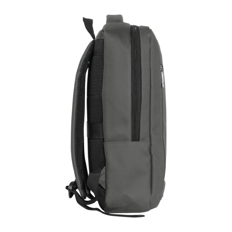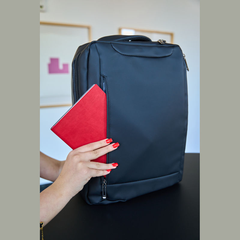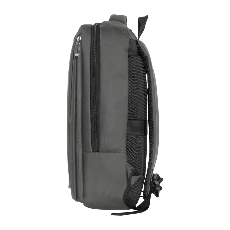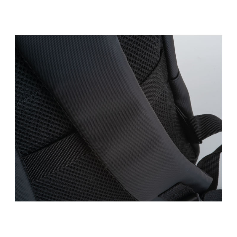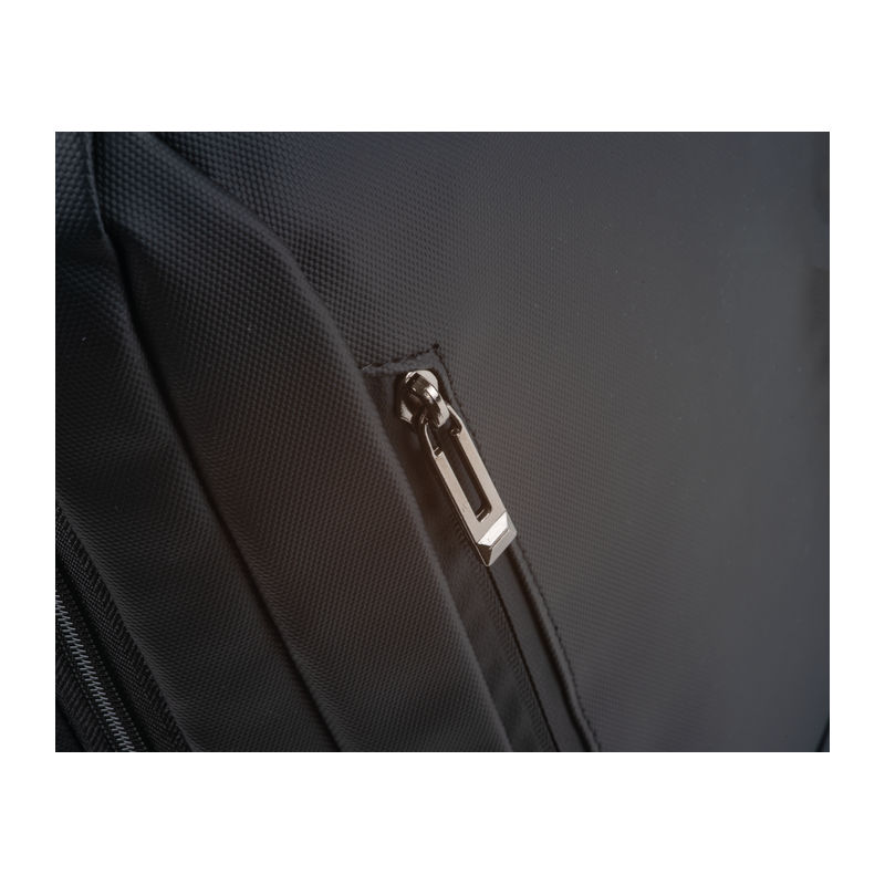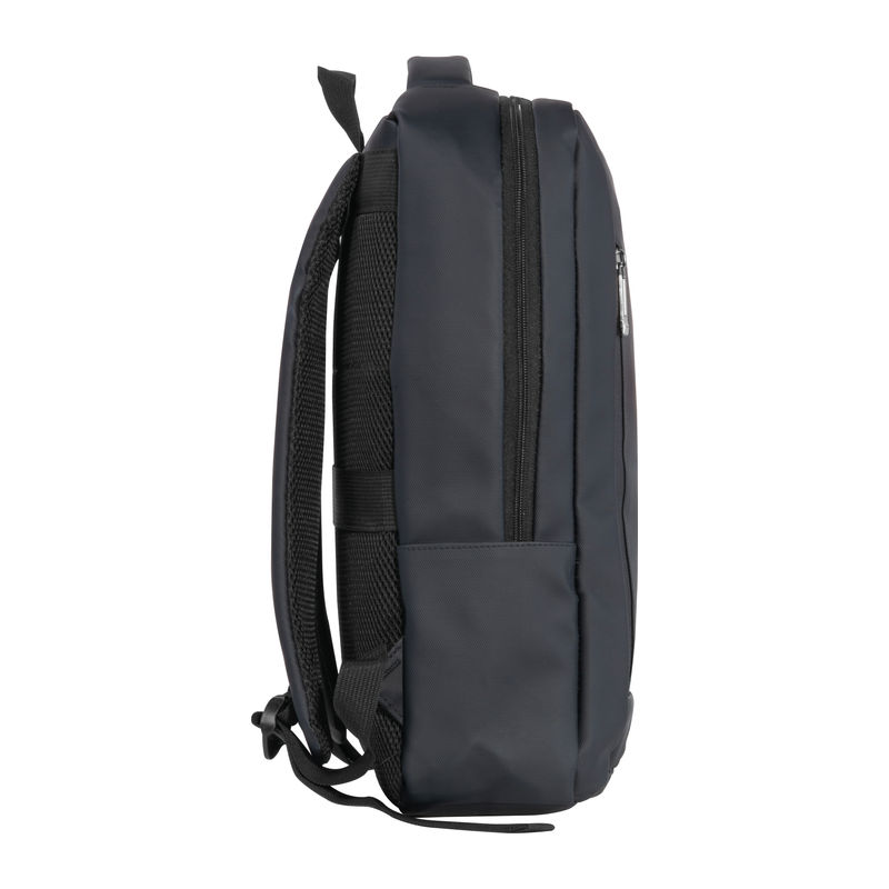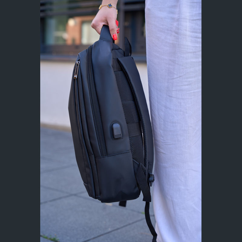 PU laptop backpack designed for 15-16 inch laptops. Features two zippered front compartments, a large main padded laptop compartment, multiple internal slip pockets, padded shoulder straps, a carry handle, and a rear strap for trolley attachment.