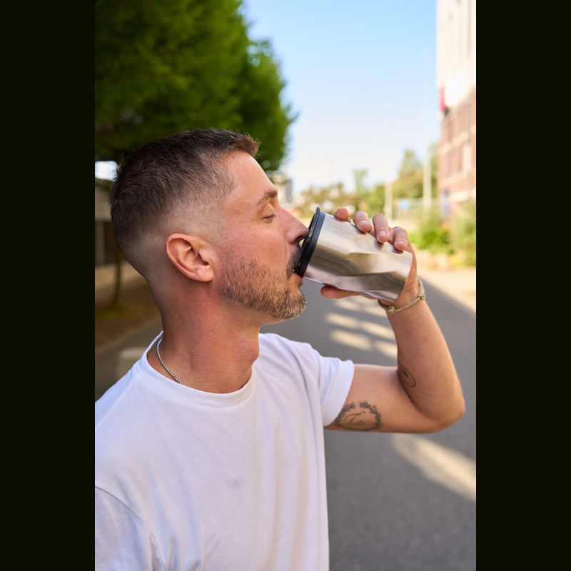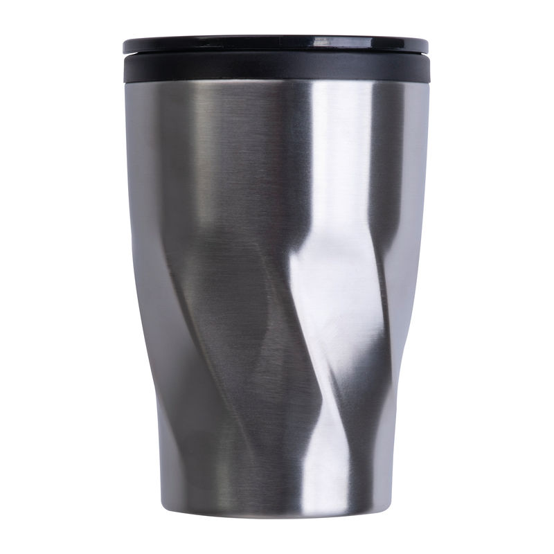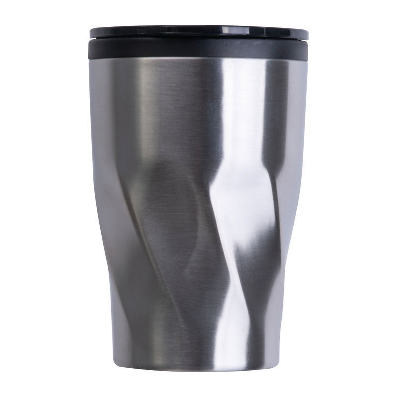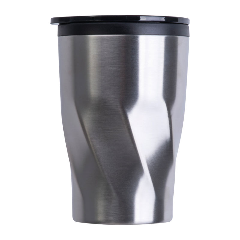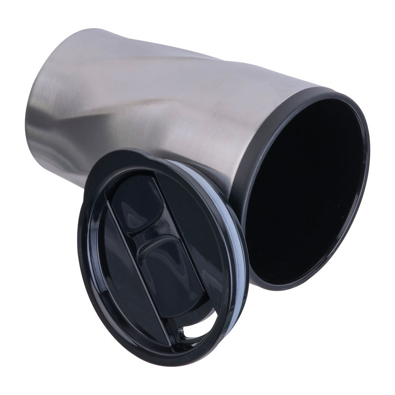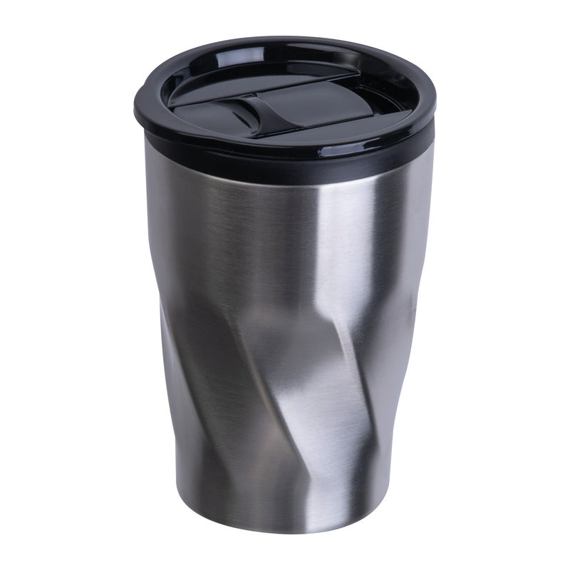 Double-walled stainless steel thermos mug with a polypropylene (PP) inner lining, featuring a lid with a sliding drinking panel and a capacity of 350 ml. Suitable for carbonated beverages.