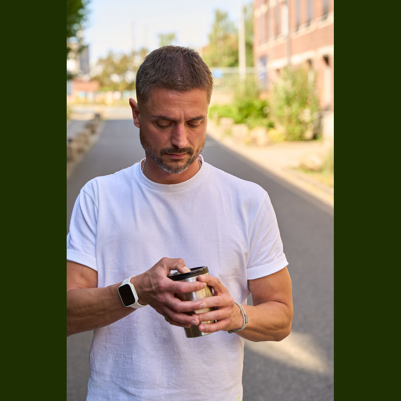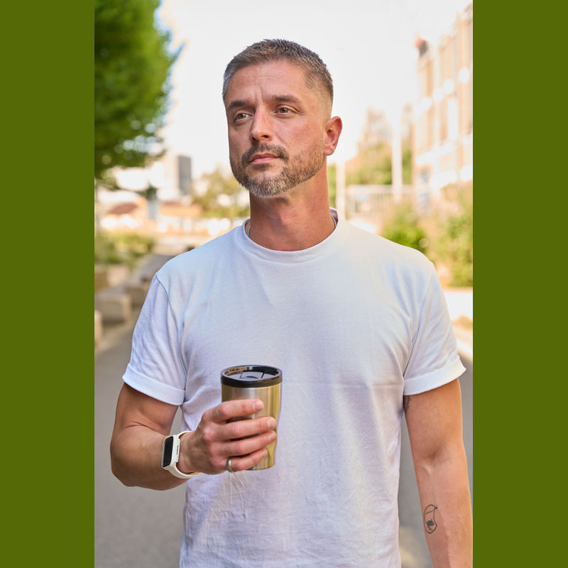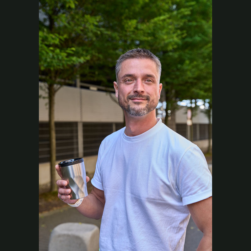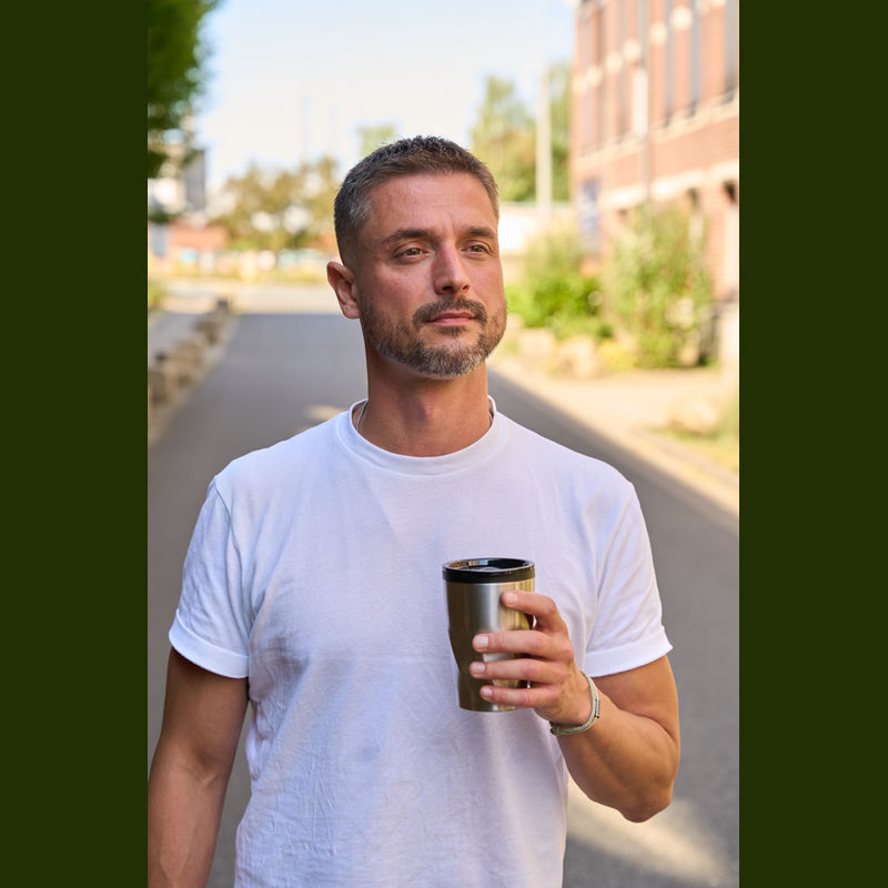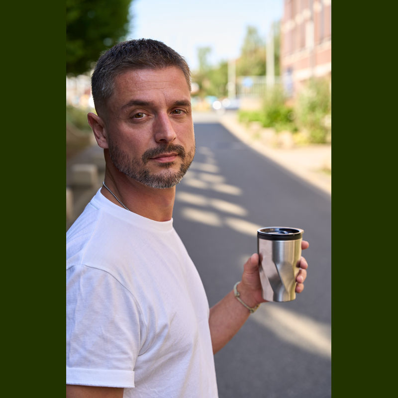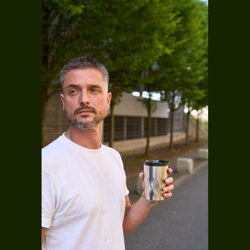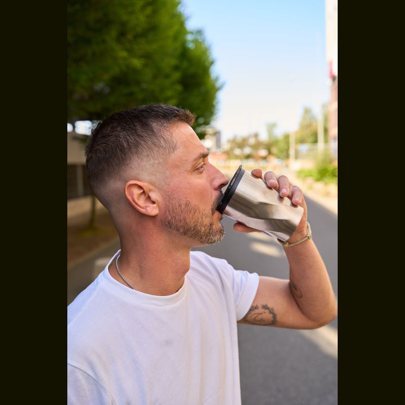 Double-walled stainless steel thermos mug with a polypropylene (PP) inner lining, featuring a lid with a sliding drinking panel and a capacity of 350 ml. Suitable for carbonated beverages.