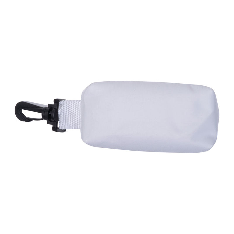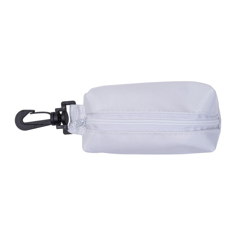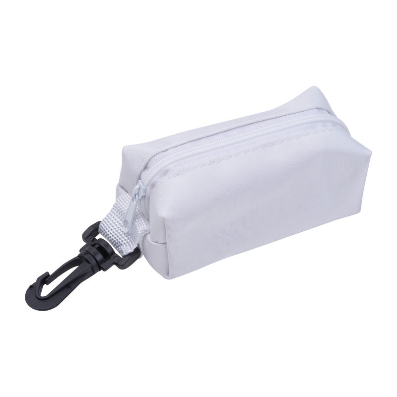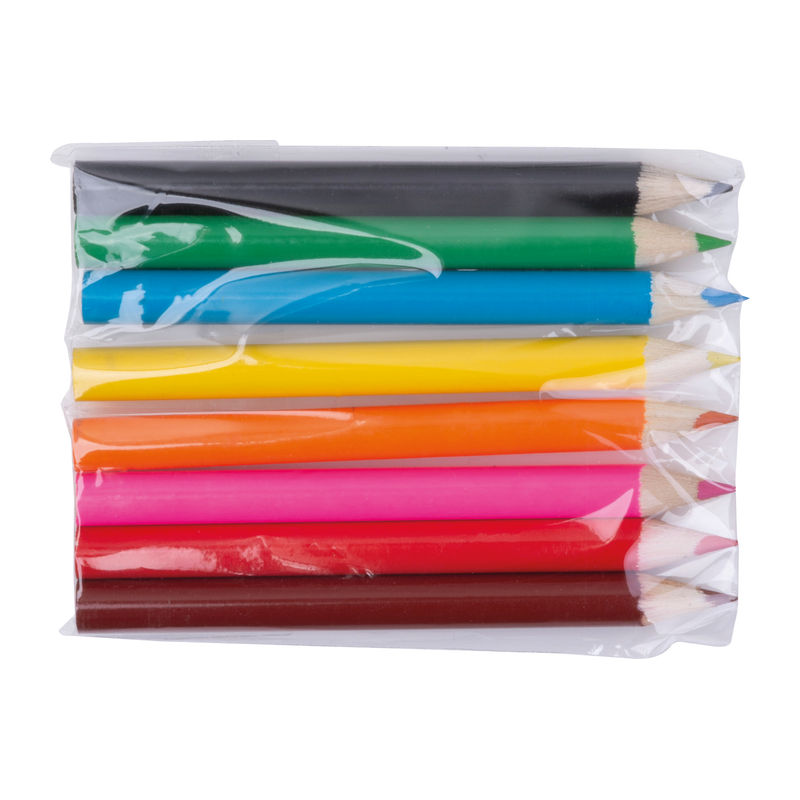 Polyester pencil case featuring a zip closure and a plastic carabiner hook, supplied with eight assorted coloured pencils.