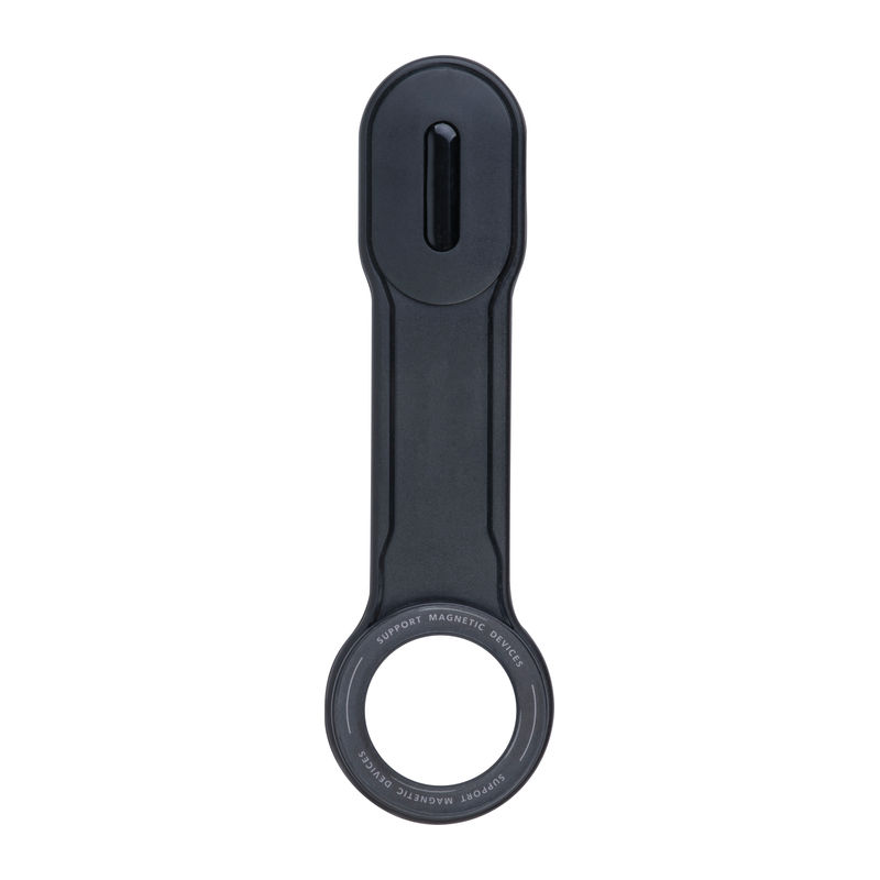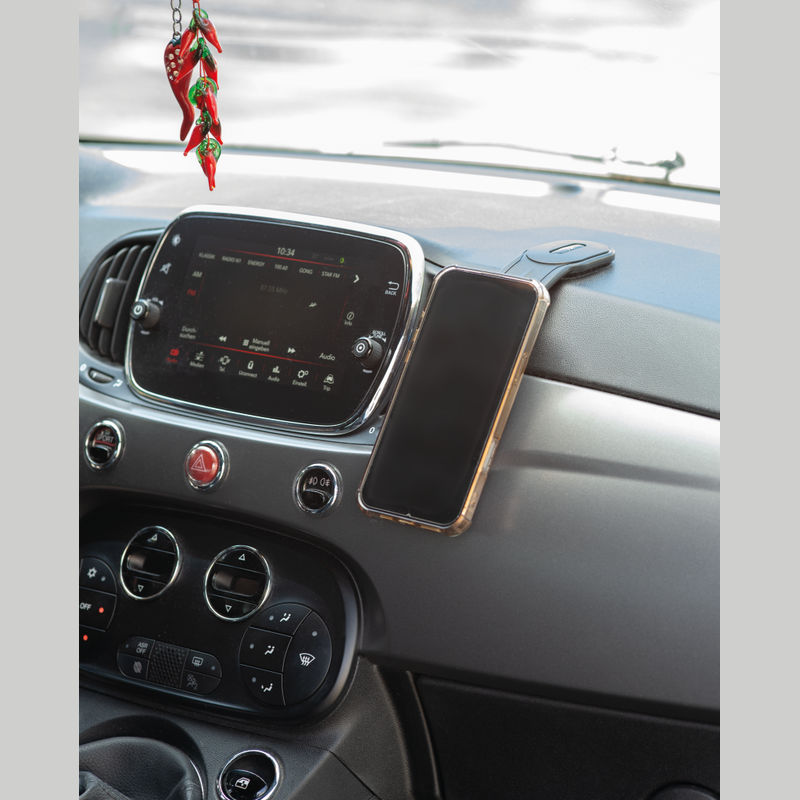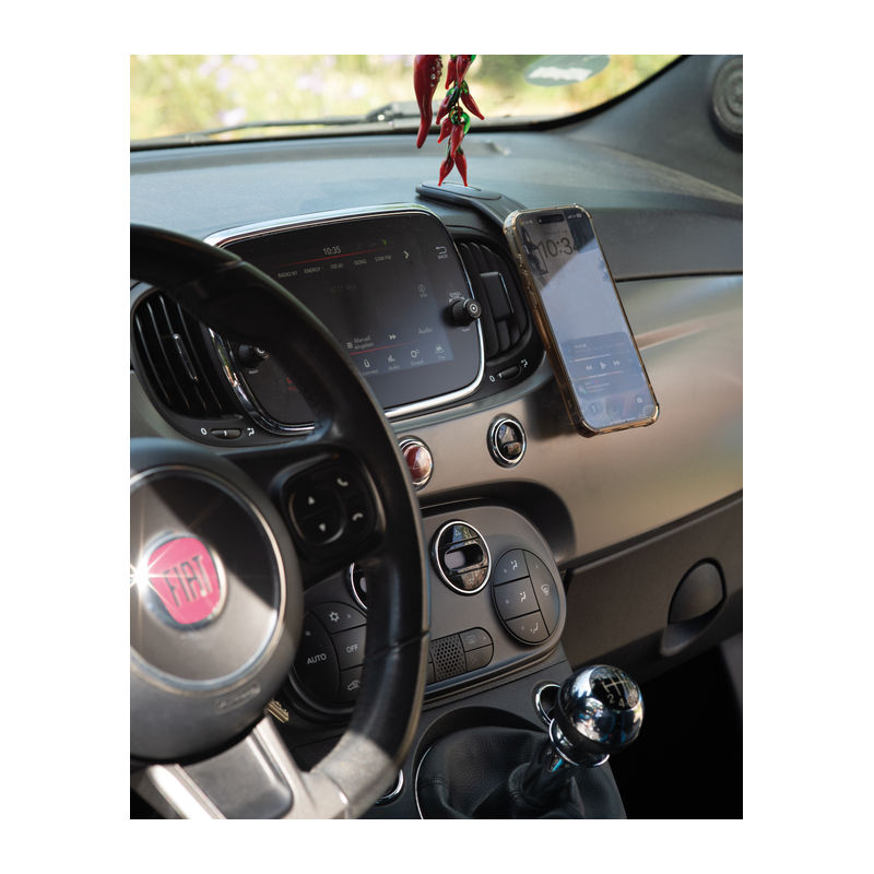 A magnetic mobile phone holder designed for use in vehicles. The holder can be affixed at any desired location within the car using an adhesive sticker. Thanks to the strong Velcro fastening, it can be easily removed at any time. The ring incorporates a magnet that attaches securely to compatible smartphones; for non-magnetic devices, an adhesive magnetic ring is included.