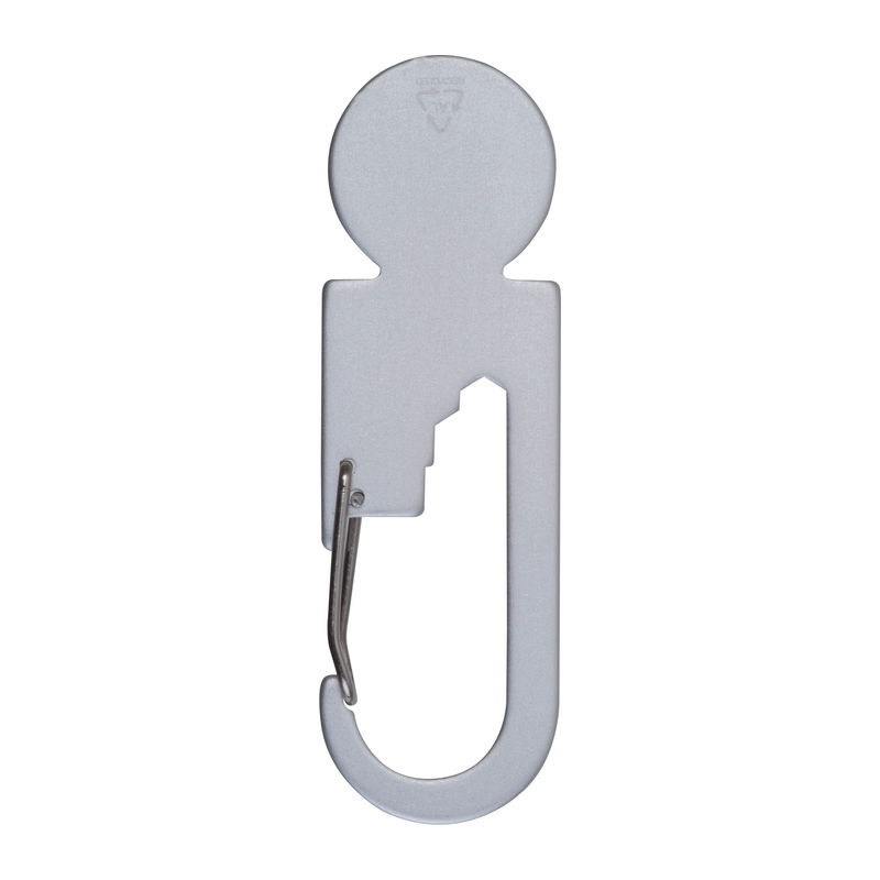 Aluminium multitool featuring a shopping trolley token, three hex keys of varying sizes, and a carabiner.
