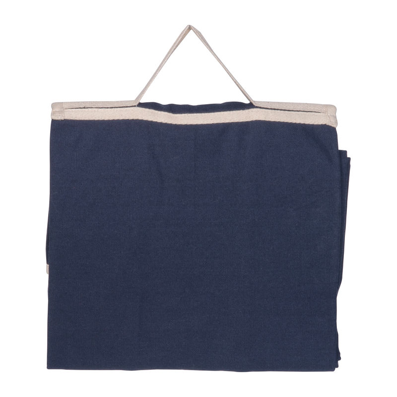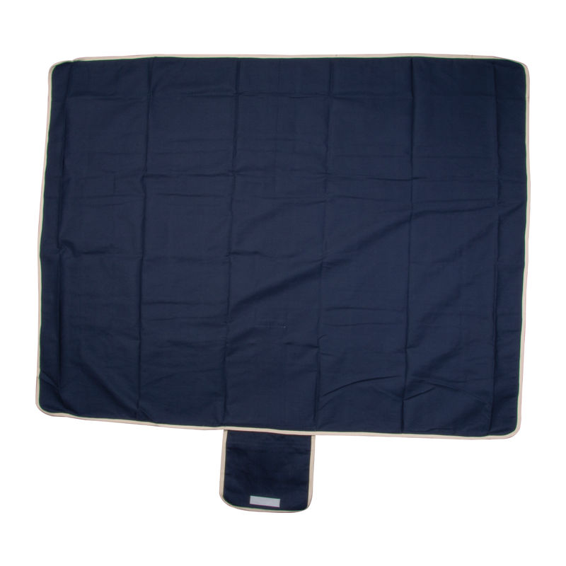 Picnic blanket crafted from recycled cotton (320 g/m²), featuring a carrying handle, a zippered pocket, and a flap secured with Velcro. Dimensions when unfolded: 160 x 128 cm.