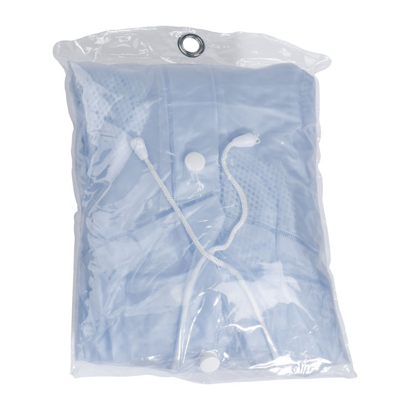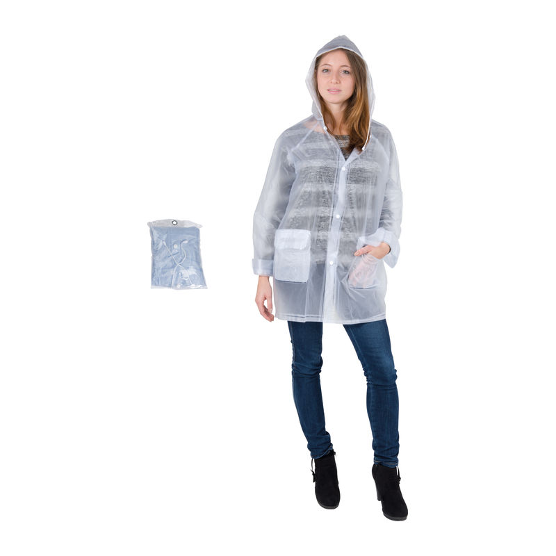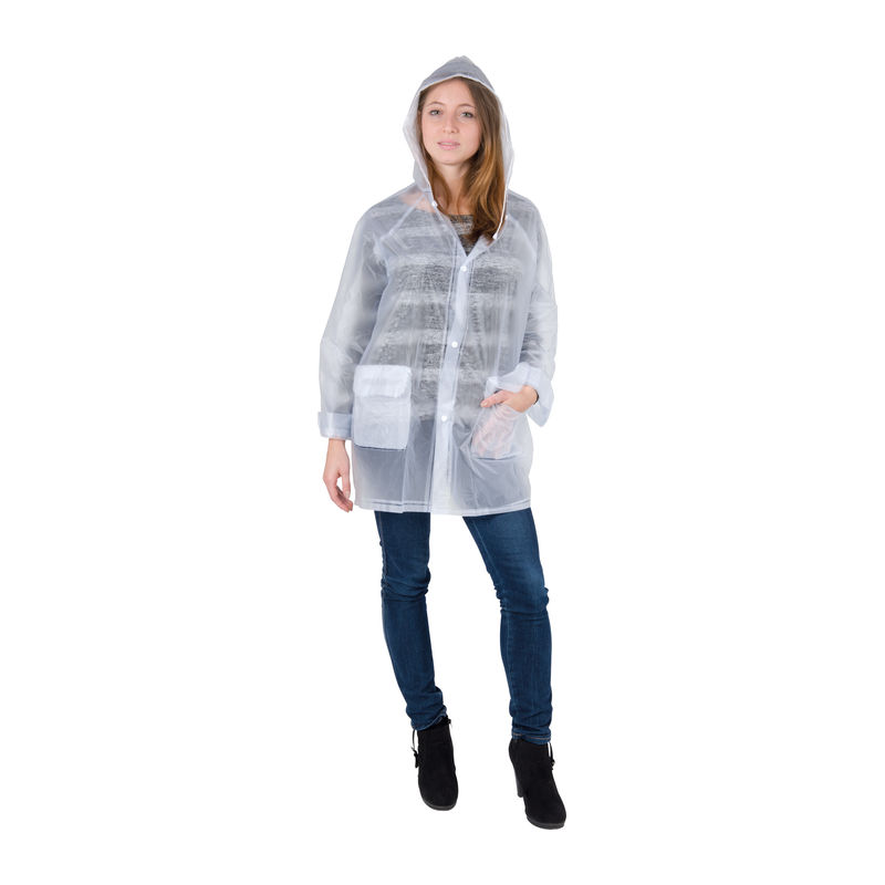 Remain dry in wet weather with this PVC raincoat featuring a hood, two pockets, and pushbuttons, available in size XL.
