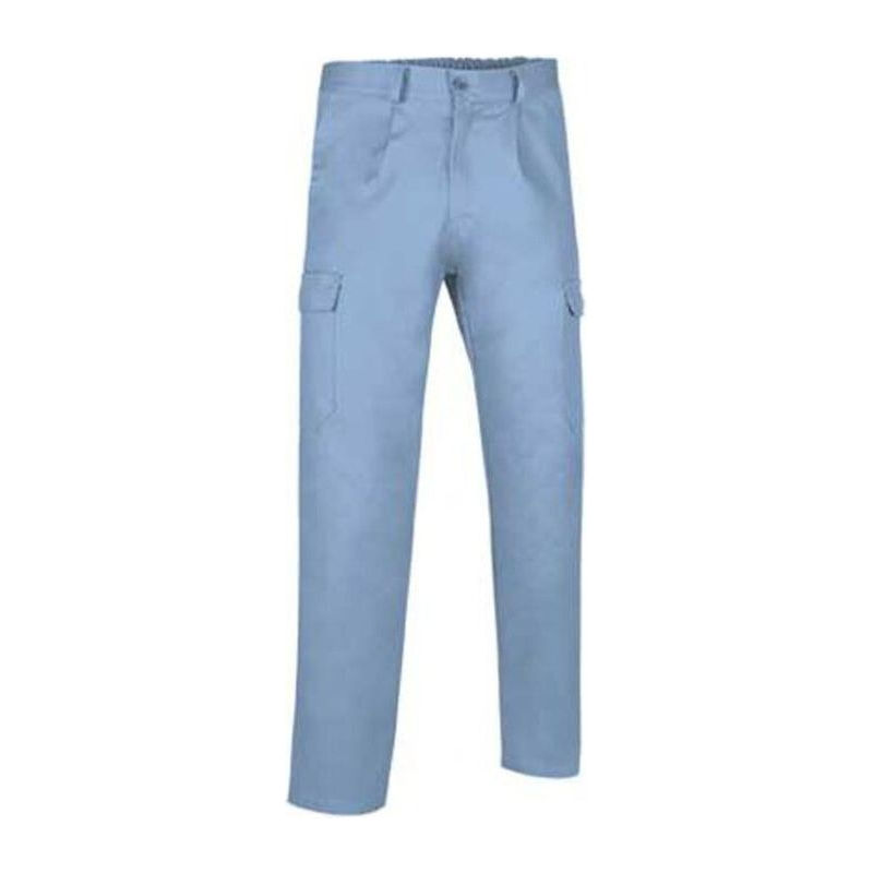 65% polyester, 35% cotton. 210 grs/m² twill fabric. Waist with elastic in back. 2 waist pockets. 2 lateral cargo pockets with velcro. 1 right back pocket. Button and zipper closure. 20 units per box: 1 size, 1 color. Individual bag.