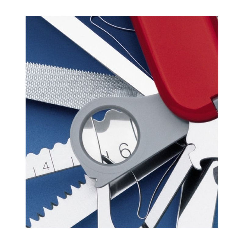 Features: 1. large blade 2. small blade 3. corkscrew 4. can opener with 5. small screwdriver 6. cap lifter with- 7. screwdriver 8. wire stipper 9. reamer 10. key ring 11. tweezers 12. scissors 13. toothpick 14. multi-purpose hook (parcel carrier) 15. wood saw 16. fish scaler with 17. hook disgorger 18. ruler (cm + inches) 19. nailfile with 20. metal file 21. nail cleaner 22. metal saw 23. fine screwdriver 24. chisel/scraper 25. pliers with 26. wire crimping tool 27. wire cutters 28. Phillips screwdriver 29. magnifying glass 30. ballpoint pen 31. pin stainless 32. mini-screwdriver 33. sewing eye