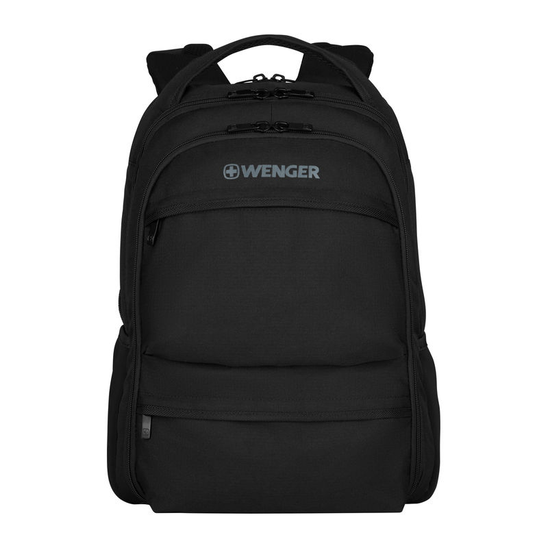 Black Wenger Fuse rucksack for 16-inch laptop. Padded computer compartment for up to a 15.6" / 41 cm laptop. Padded neoprene pocket for a 10" / 25 cm tablet / eReader.