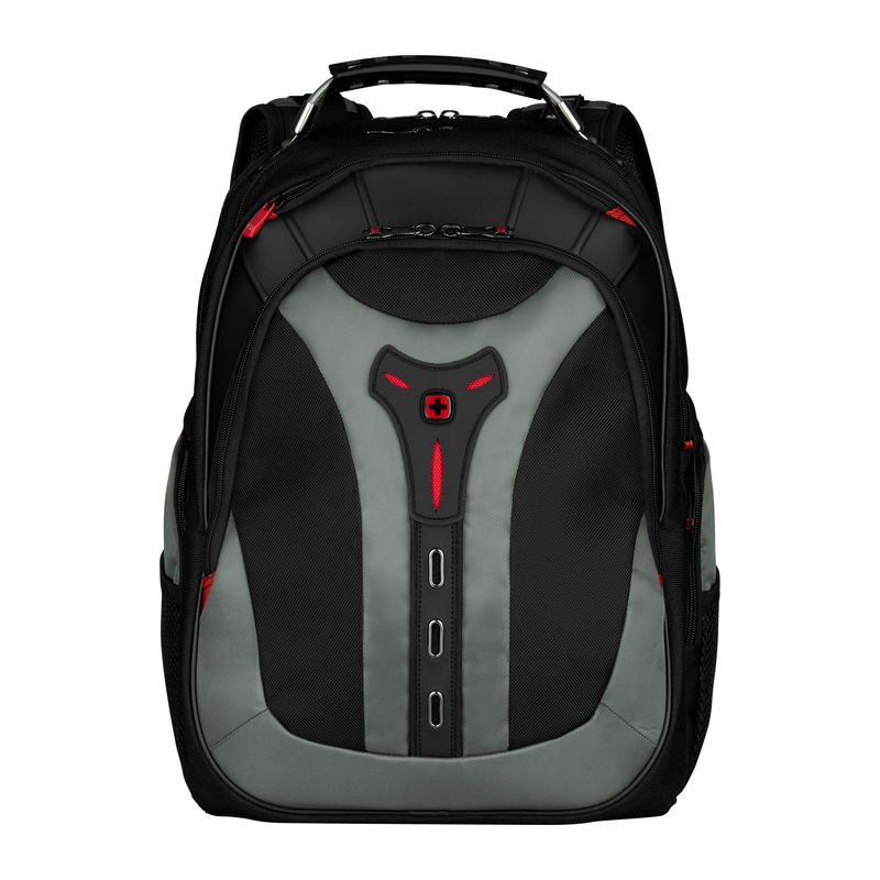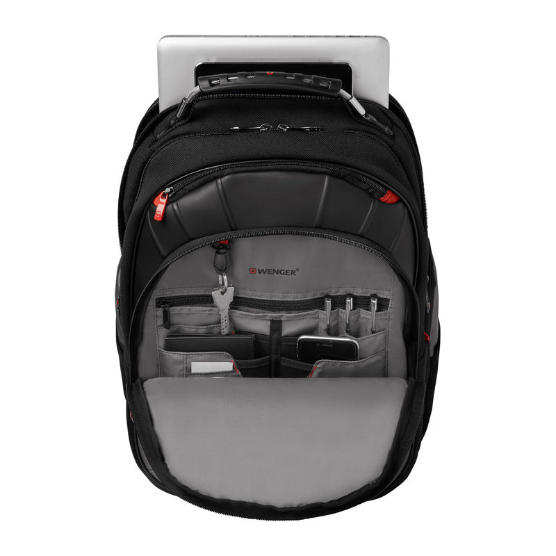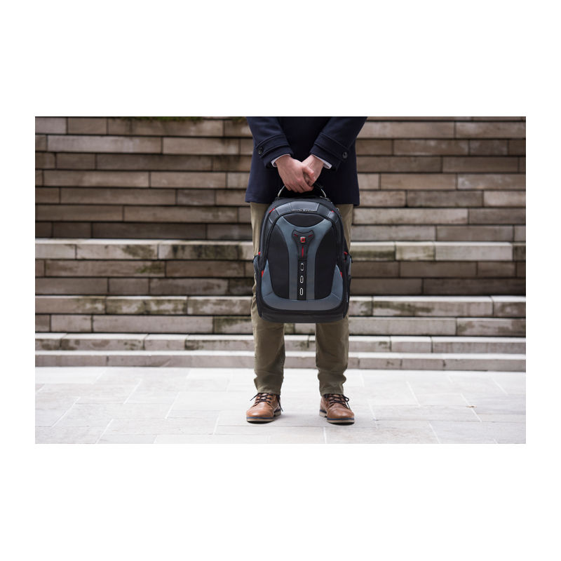 Effectively protects up to most 17” laptops. Contains quick pocket for easy access to keys, phone etc., air-flow back padding, stabilizing platform keeps the backpack standing upright, reinforced ergonomic handle, shock absorbing shoulder straps.