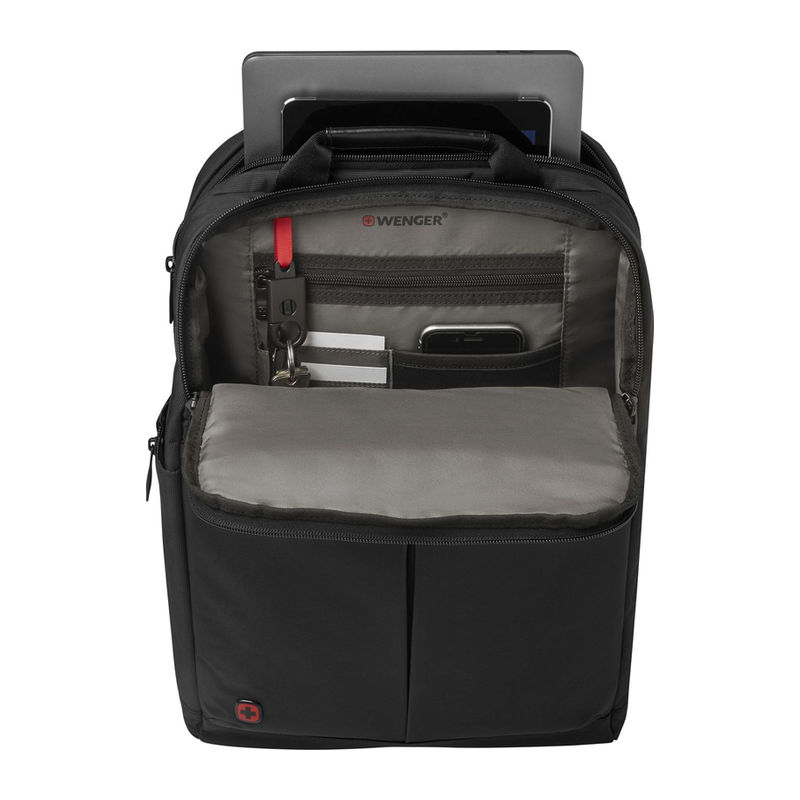 Backpack with padded 16” laptop compartment and 10” tablet pocket, comfort-fit shoulder straps, padded grab handle, Quik Pocket for easy access to items you need most frequently, essentials organizer, zippered side pocket, front zippered pocket